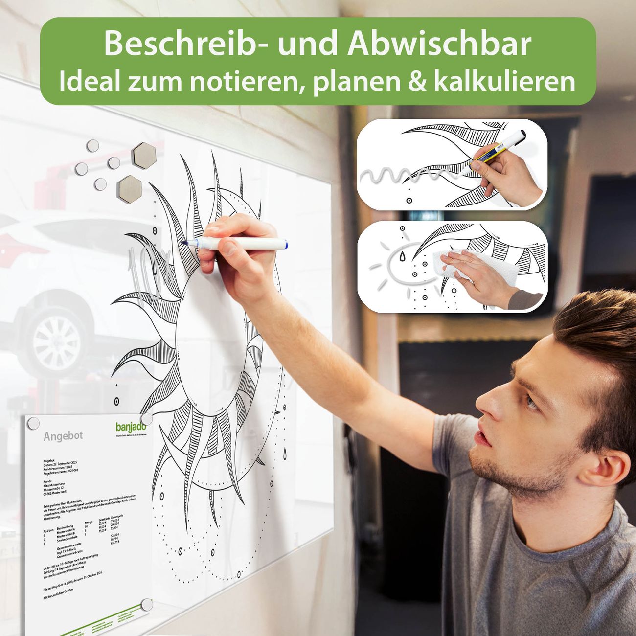Jede Glas Magnettafel wird in unserer Werkstatt von Hand gefertigt und sorgfältig geprüft. So erhalten Sie ein echtes Qualitätsprodukt, das Funktion und Ästhetik perfekt vereint.?? Warum banjado?