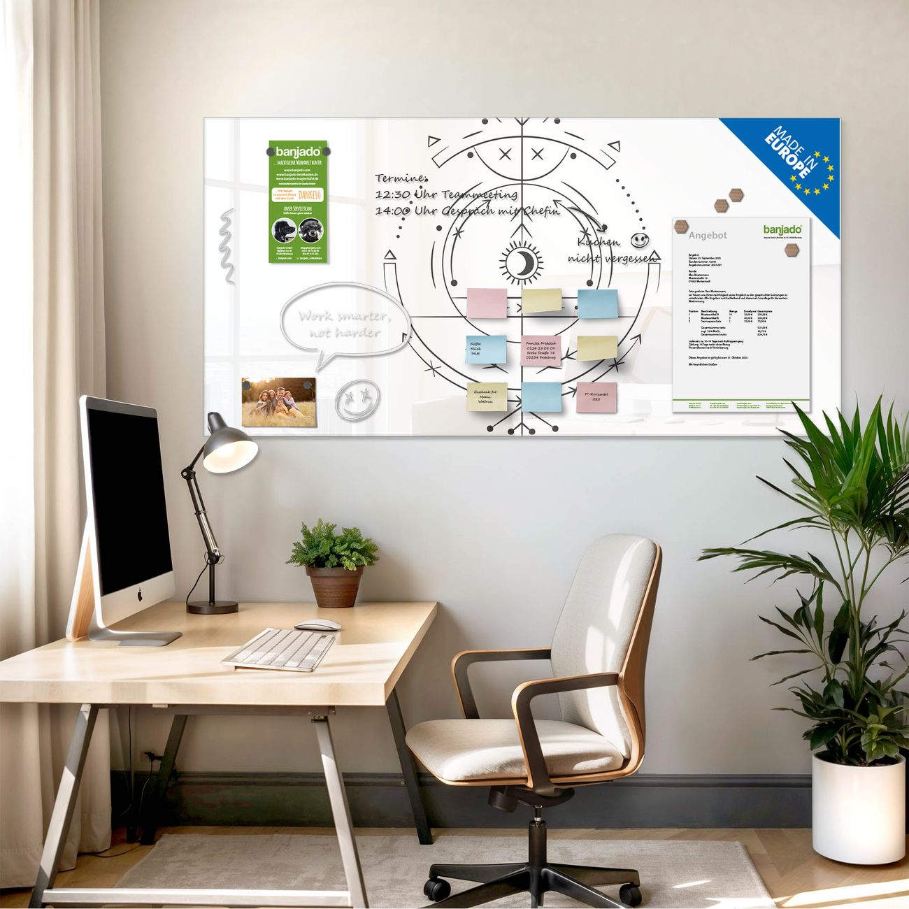 Jede Glas Magnettafel wird in unserer Werkstatt von Hand gefertigt und sorgfältig geprüft. So erhalten Sie ein echtes Qualitätsprodukt, das Funktion und Ästhetik perfekt vereint.?? Warum banjado?