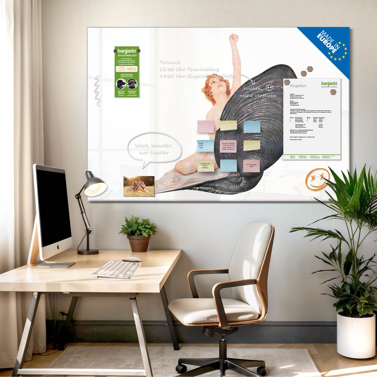 Jede Glas Magnettafel wird in unserer Werkstatt von Hand gefertigt und sorgfältig geprüft. So erhalten Sie ein echtes Qualitätsprodukt, das Funktion und Ästhetik perfekt vereint.?? Warum banjado?