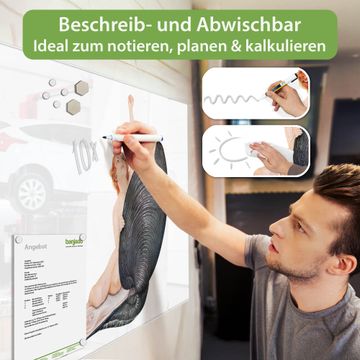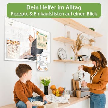 Auf der glatten Glasoberfläche lassen sich Termine, Rezepte oder Notizen ganz einfach mit Kreidestiften festhalten und rückstandslos entfernen. Starke Neodym-Magnete halten Ihre wichtigsten Erinnerungen sicher an Ort und Stelle. So entsteht Ihre ganz persönliche Ideenwand - jeden Tag neu.