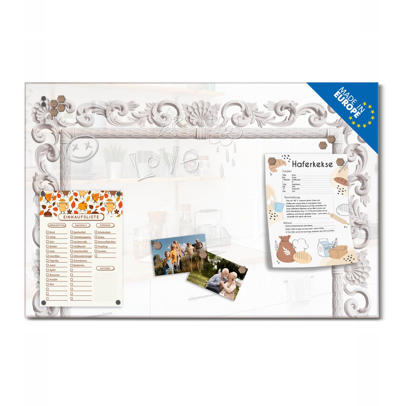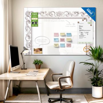 Ein Stück Design, das Ihren Alltag organisiert. Schreiben, heften, inspirieren - alles an einem Ort. Qualität, die man spürt. Montage leicht gemacht. Handwerk mit Herz - veredelt in Sachsen. Einzigartiges Design mit Motiv Motiv Barocker Bilderrahmen Beschreibbare Glasoberfläche, leicht zu reinigen Starke Magnetkraft durch Stahlrückwand Inklusive 4 Neodym-Magneten Flexible Montageoptionen Handveredelt in Sachsen - Qualität, die bleibt