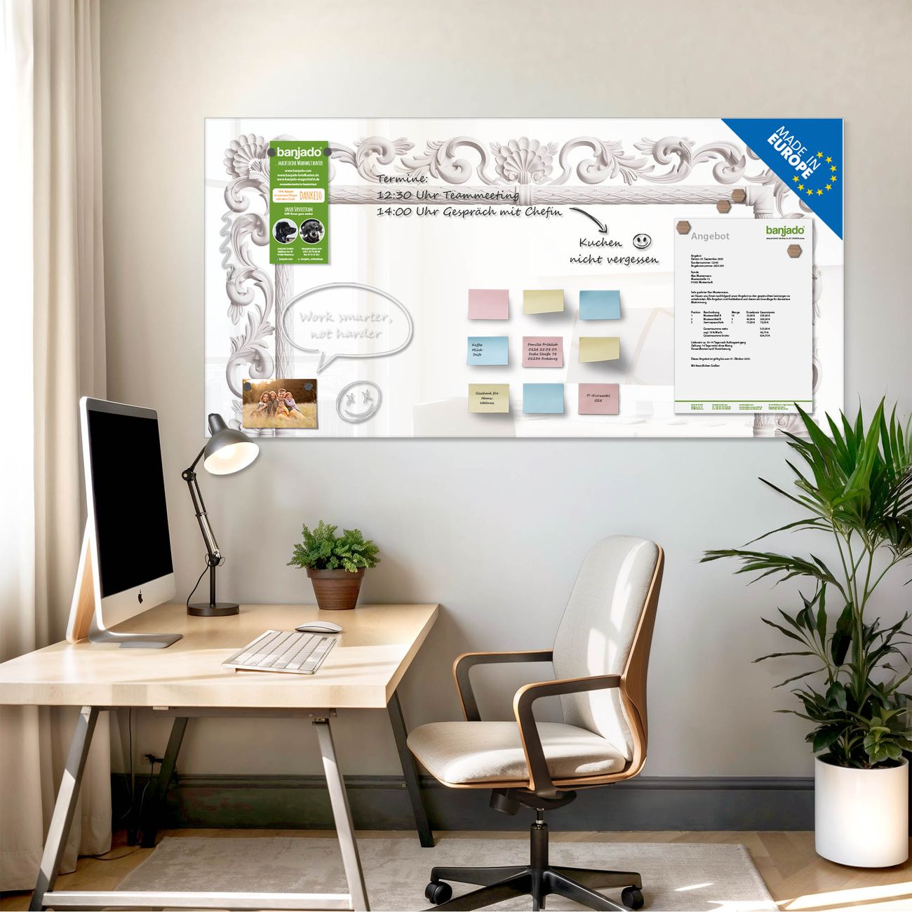 Jede Glas Magnettafel wird in unserer Werkstatt von Hand gefertigt und sorgfältig geprüft. So erhalten Sie ein echtes Qualitätsprodukt, das Funktion und Ästhetik perfekt vereint.?? Warum banjado?