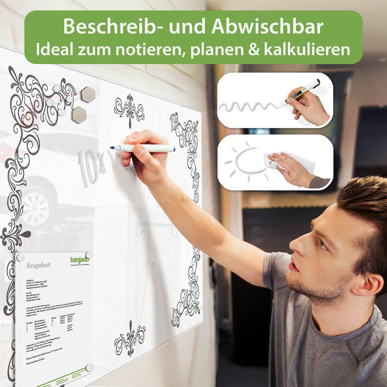 Jede Glas Magnettafel wird in unserer Werkstatt von Hand gefertigt und sorgfältig geprüft. So erhalten Sie ein echtes Qualitätsprodukt, das Funktion und Ästhetik perfekt vereint.?? Warum banjado?