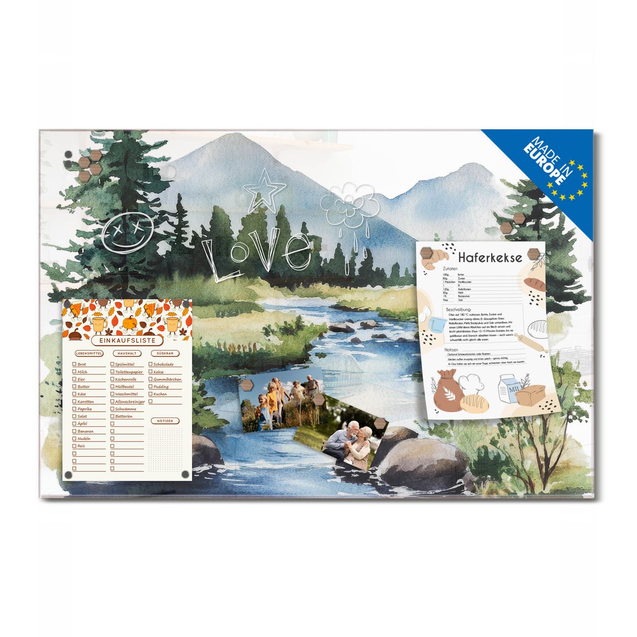 Ein Stück Design, das Ihren Alltag organisiert. Schreiben, heften, inspirieren - alles an einem Ort. Qualität, die man spürt. Montage leicht gemacht. Handwerk mit Herz - veredelt in Sachsen. Einzigartiges Design mit Motiv Motiv Bergfluss in der Natur Beschreibbare Glasoberfläche, leicht zu reinigen Starke Magnetkraft durch Stahlrückwand Inklusive 4 Neodym-Magneten Flexible Montageoptionen Handveredelt in Sachsen - Qualität, die bleibt