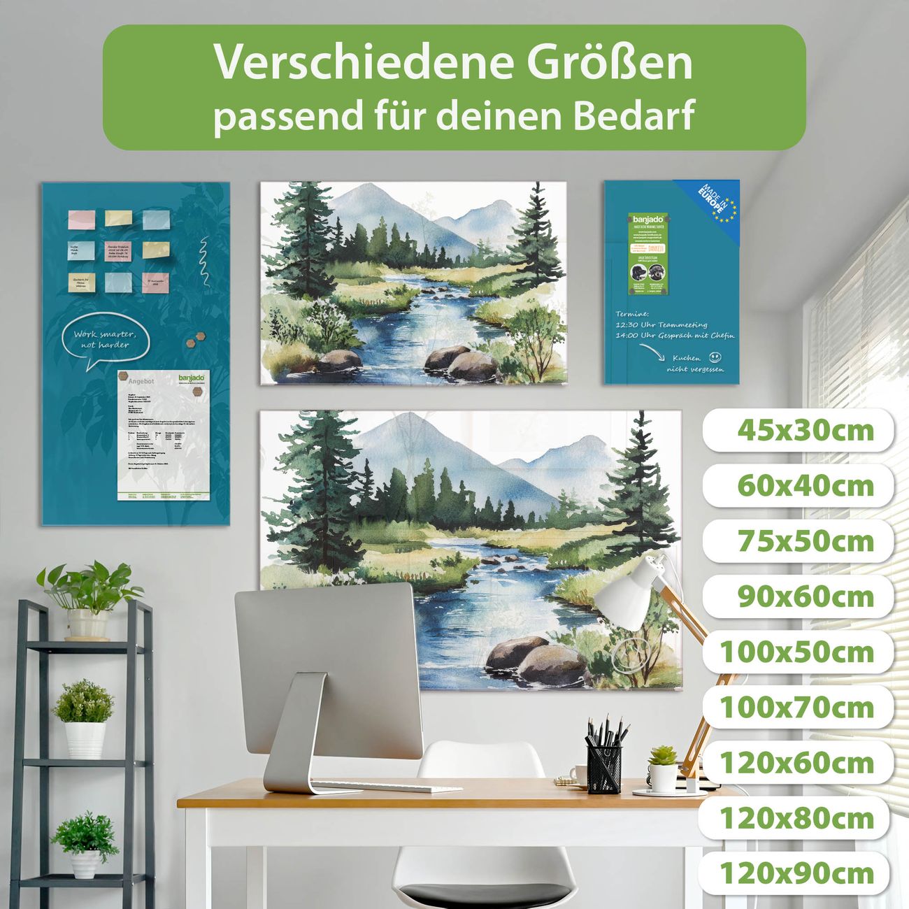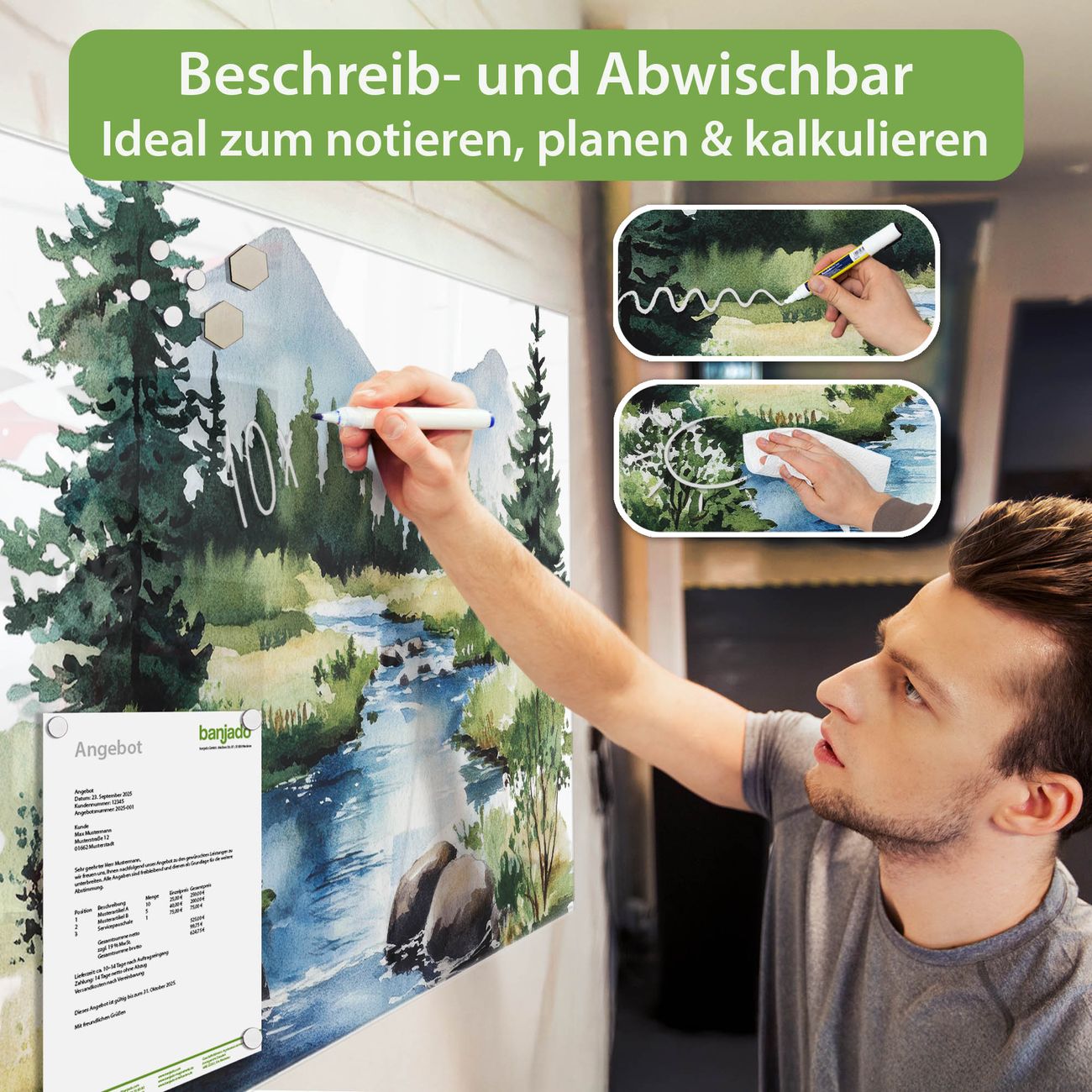 Jede Glas Magnettafel wird in unserer Werkstatt von Hand gefertigt und sorgfältig geprüft. So erhalten Sie ein echtes Qualitätsprodukt, das Funktion und Ästhetik perfekt vereint.?? Warum banjado?