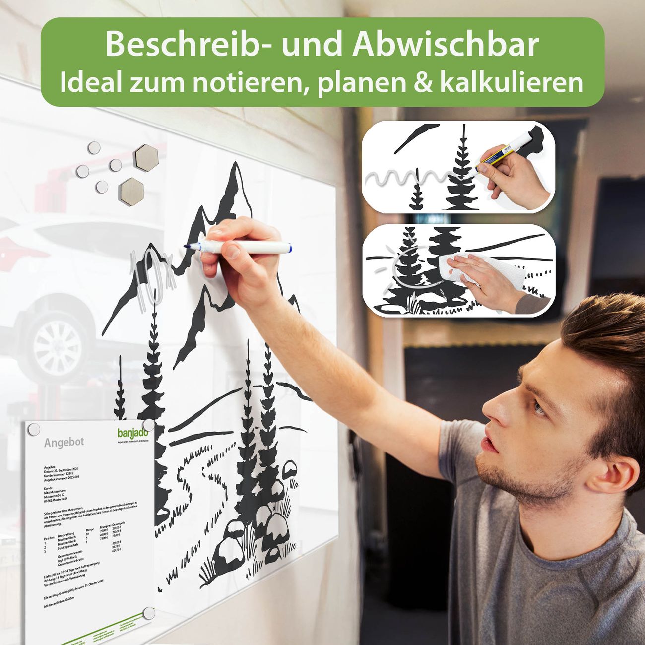 Jede Glas Magnettafel wird in unserer Werkstatt von Hand gefertigt und sorgfältig geprüft. So erhalten Sie ein echtes Qualitätsprodukt, das Funktion und Ästhetik perfekt vereint.?? Warum banjado?