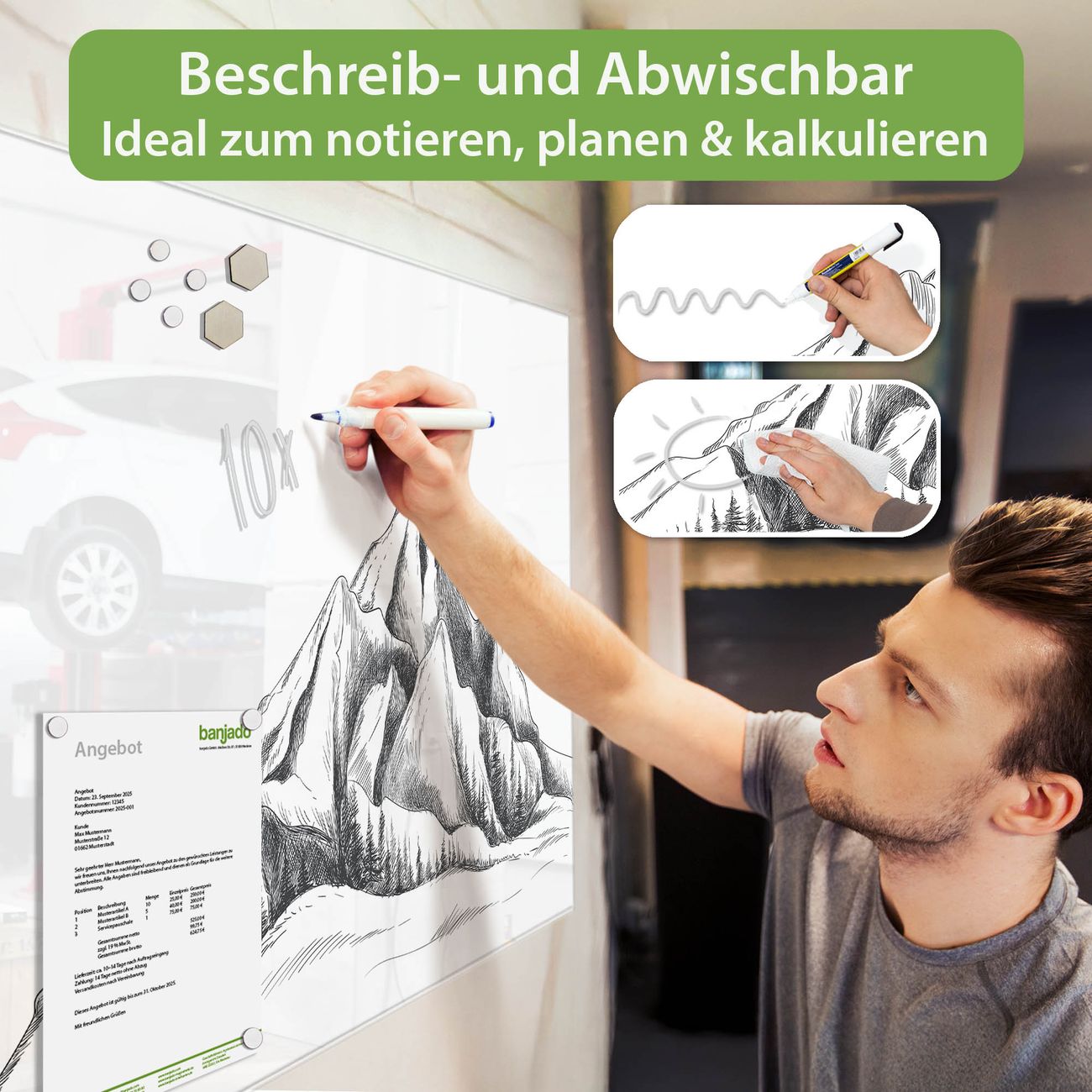 Jede Glas Magnettafel wird in unserer Werkstatt von Hand gefertigt und sorgfältig geprüft. So erhalten Sie ein echtes Qualitätsprodukt, das Funktion und Ästhetik perfekt vereint.?? Warum banjado?