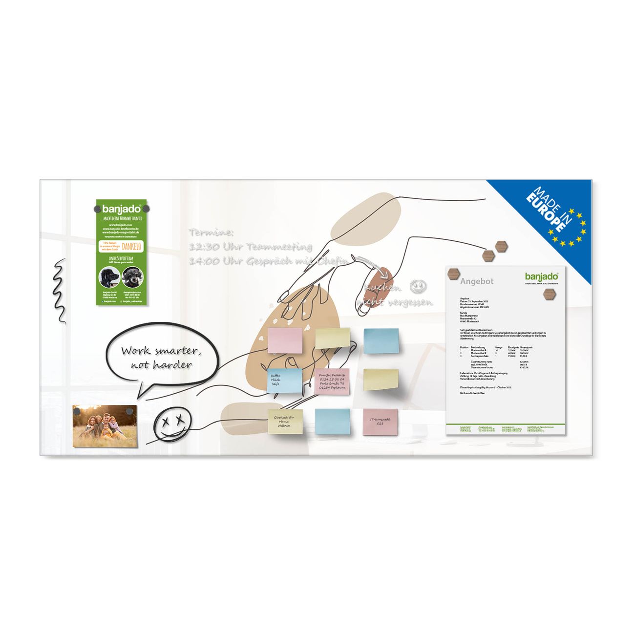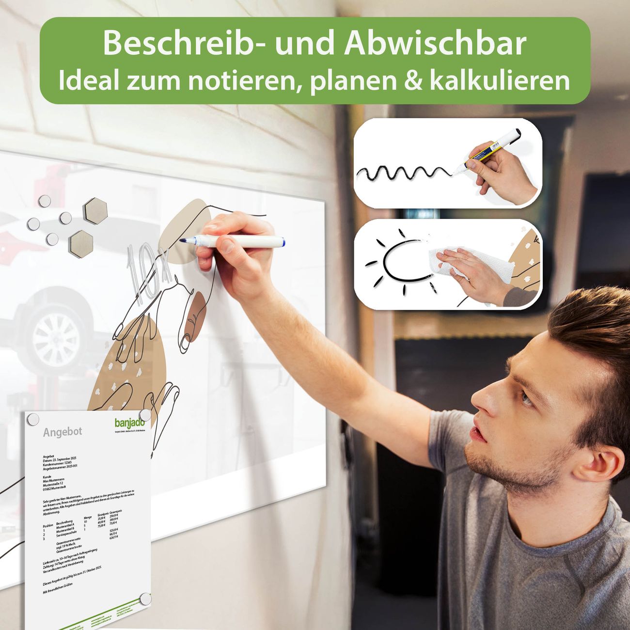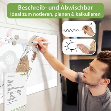 Jede Glas Magnettafel wird in unserer Werkstatt von Hand gefertigt und sorgfältig geprüft. So erhalten Sie ein echtes Qualitätsprodukt, das Funktion und Ästhetik perfekt vereint.?? Warum banjado?