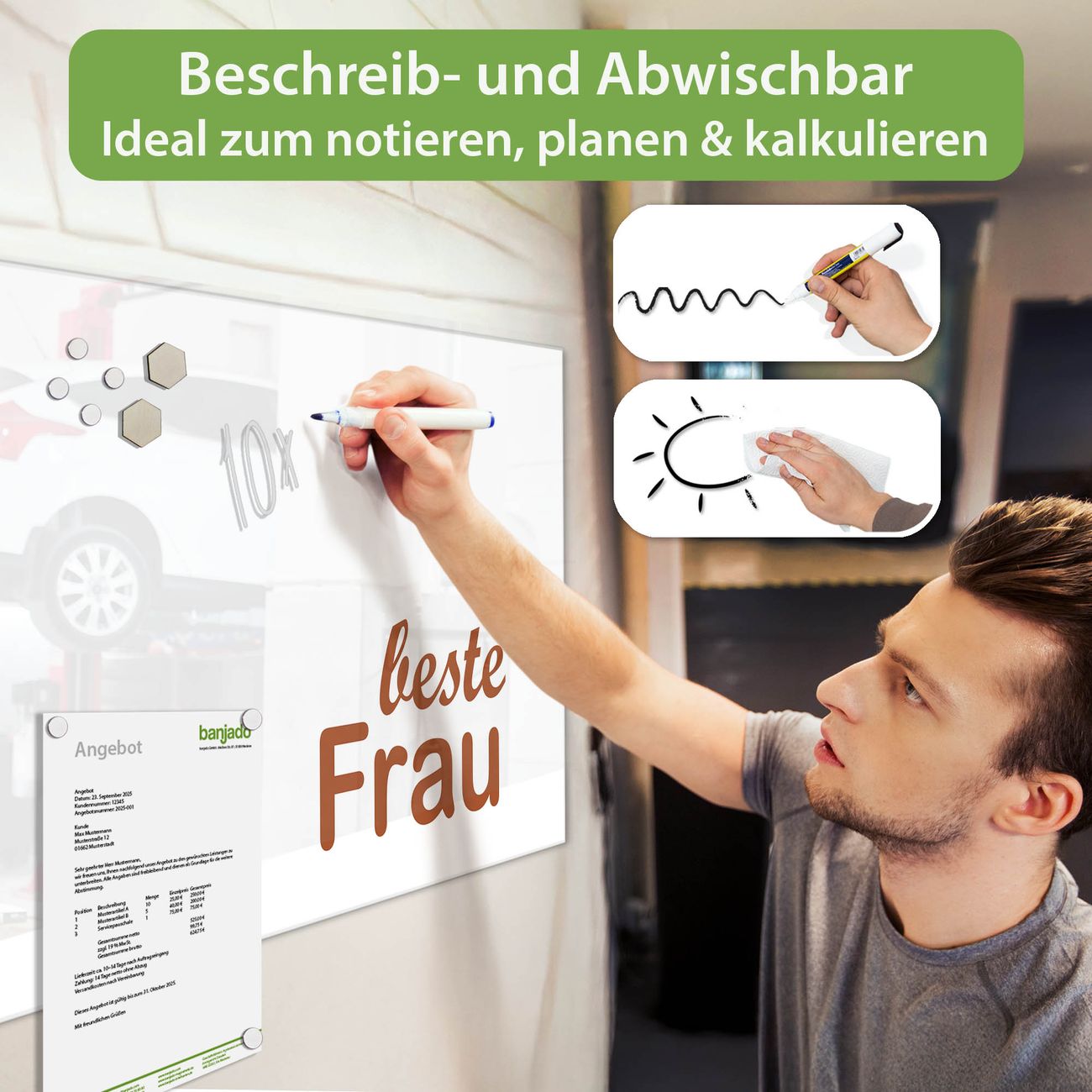 Bitte beachten Sie, dass ausschliessliche spezielle Magnete an der Glastafel haften. Wir empfehlen banjado Neodym Magnete, diese sind durch uns auf Wirksamkeit geprüft.