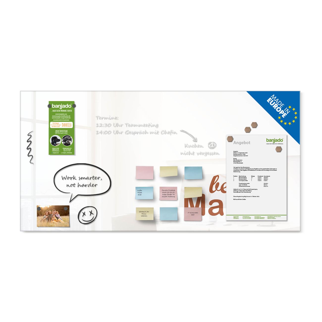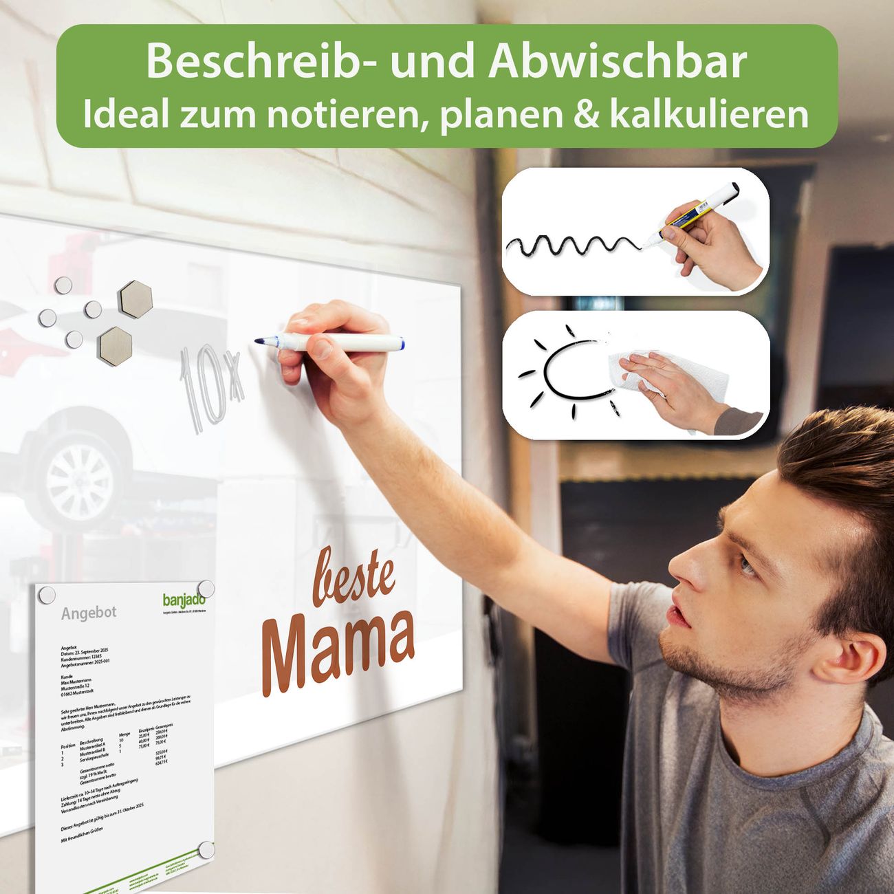 Jede Glas Magnettafel wird in unserer Werkstatt von Hand gefertigt und sorgfältig geprüft. So erhalten Sie ein echtes Qualitätsprodukt, das Funktion und Ästhetik perfekt vereint.?? Warum banjado?