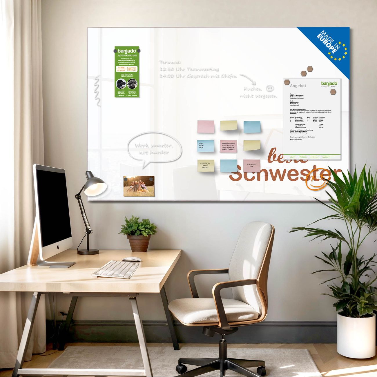 Jede Glas Magnettafel wird in unserer Werkstatt von Hand gefertigt und sorgfältig geprüft. So erhalten Sie ein echtes Qualitätsprodukt, das Funktion und Ästhetik perfekt vereint.?? Warum banjado?