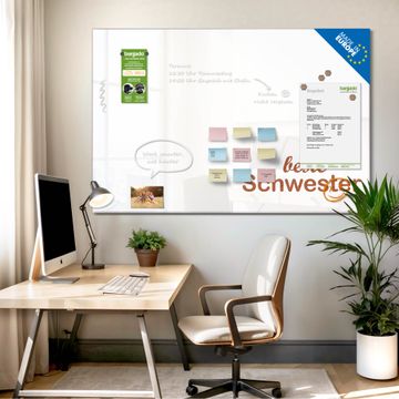Auf der glatten Glasoberfläche lassen sich Termine, Rezepte oder Notizen ganz einfach mit Kreidestiften festhalten und rückstandslos entfernen. Starke Neodym-Magnete halten Ihre wichtigsten Erinnerungen sicher an Ort und Stelle. So entsteht Ihre ganz persönliche Ideenwand - jeden Tag neu.