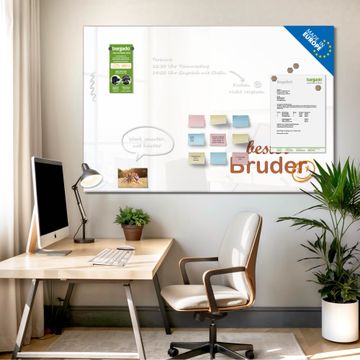 Auf der glatten Glasoberfläche lassen sich Termine, Rezepte oder Notizen ganz einfach mit Kreidestiften festhalten und rückstandslos entfernen. Starke Neodym-Magnete halten Ihre wichtigsten Erinnerungen sicher an Ort und Stelle. So entsteht Ihre ganz persönliche Ideenwand - jeden Tag neu.