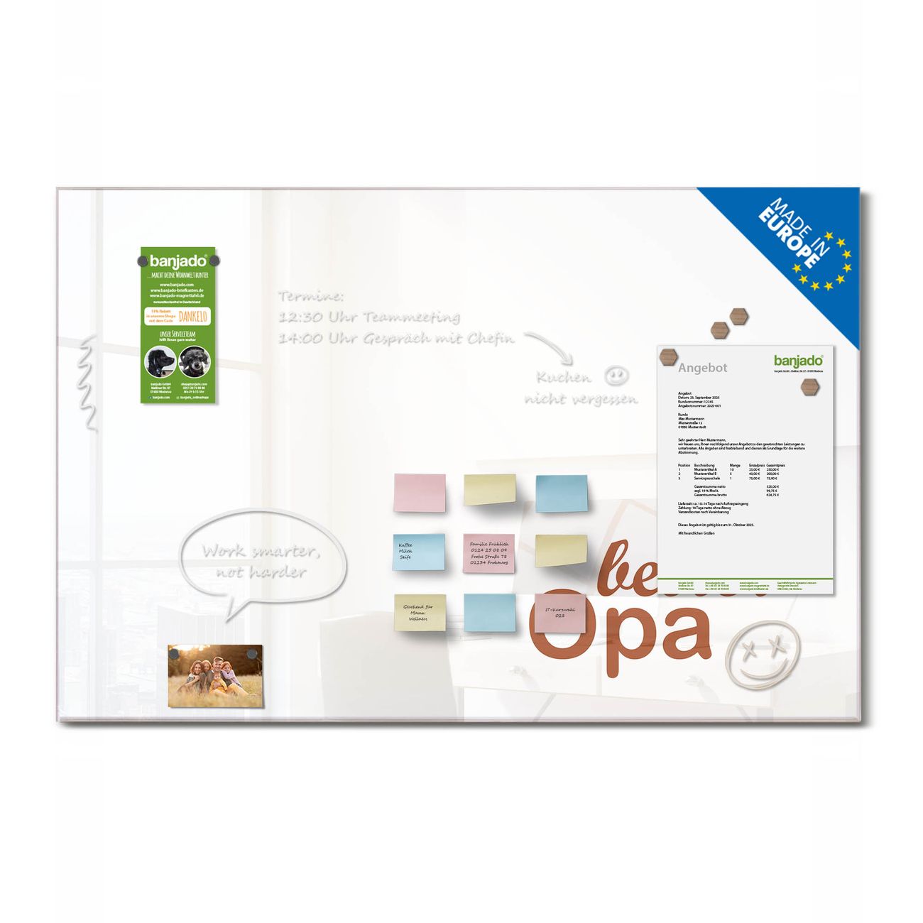 Jede Glas Magnettafel wird in unserer Werkstatt von Hand gefertigt und sorgfältig geprüft. So erhalten Sie ein echtes Qualitätsprodukt, das Funktion und Ästhetik perfekt vereint.?? Warum banjado?