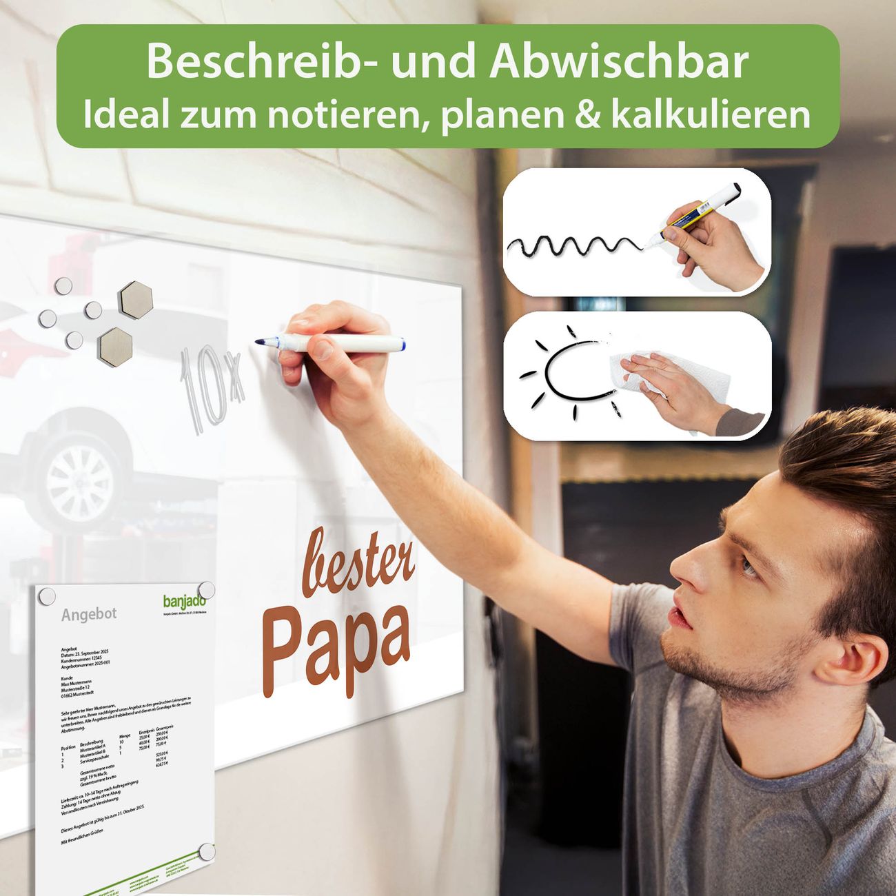 Bitte beachten Sie, dass ausschliessliche spezielle Magnete an der Glastafel haften. Wir empfehlen banjado Neodym Magnete, diese sind durch uns auf Wirksamkeit geprüft.