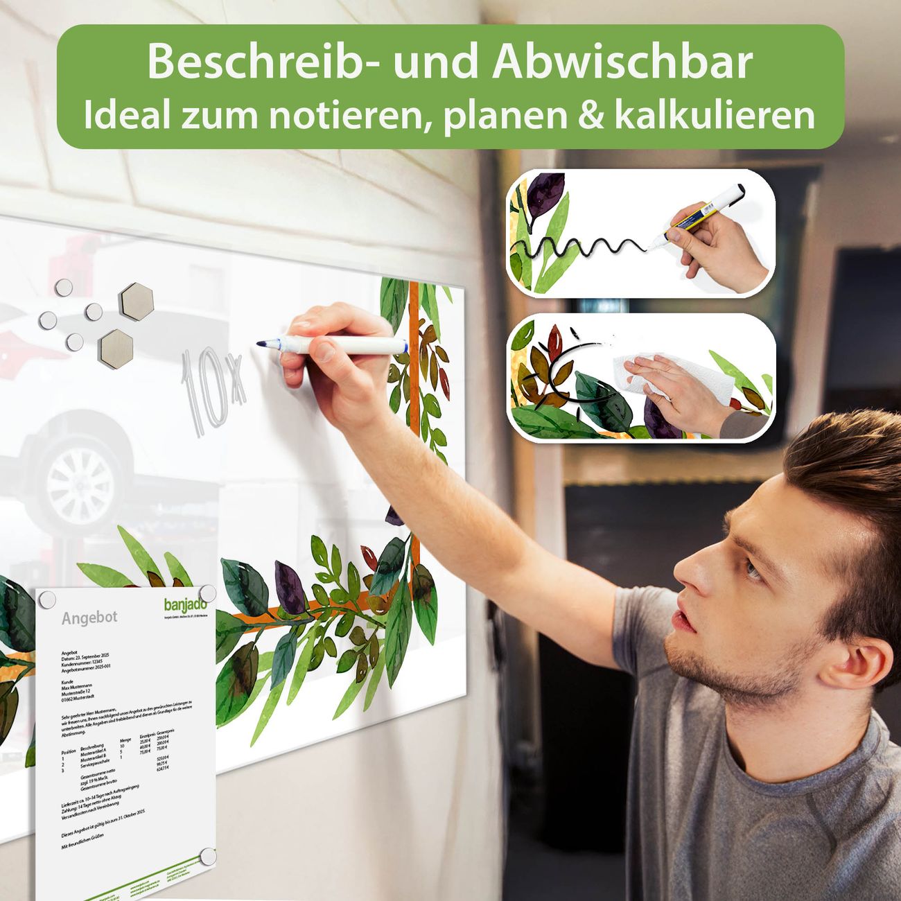 Jede Glas Magnettafel wird in unserer Werkstatt von Hand gefertigt und sorgfältig geprüft. So erhalten Sie ein echtes Qualitätsprodukt, das Funktion und Ästhetik perfekt vereint.?? Warum banjado?