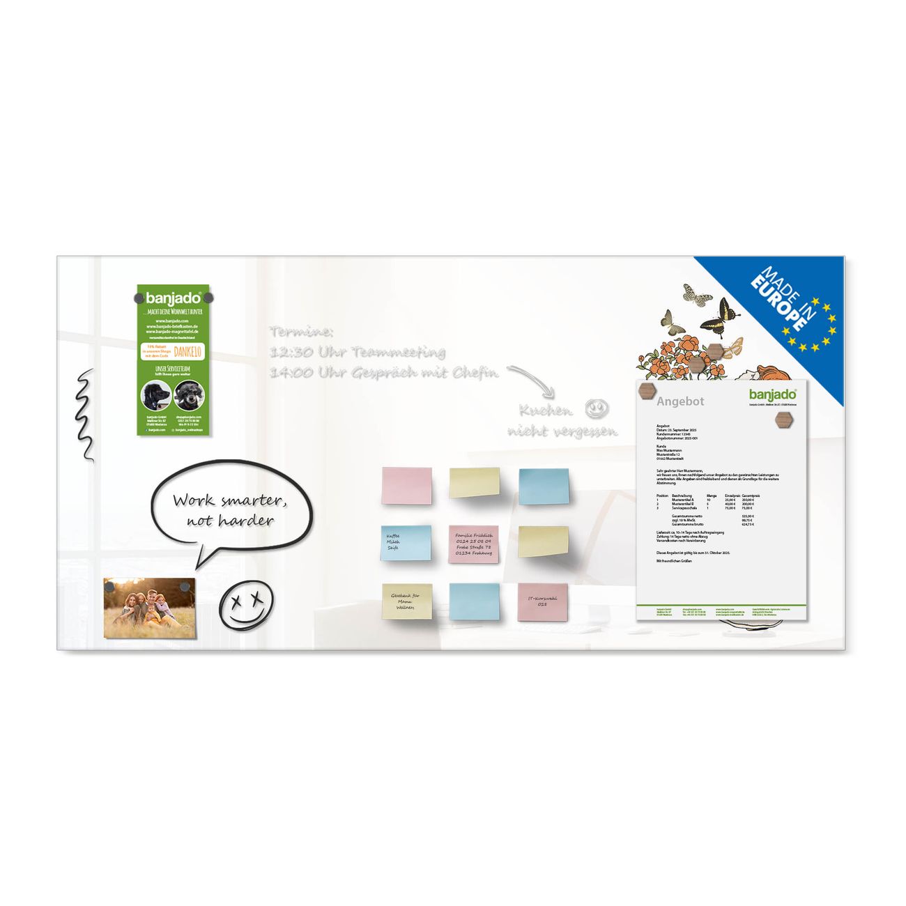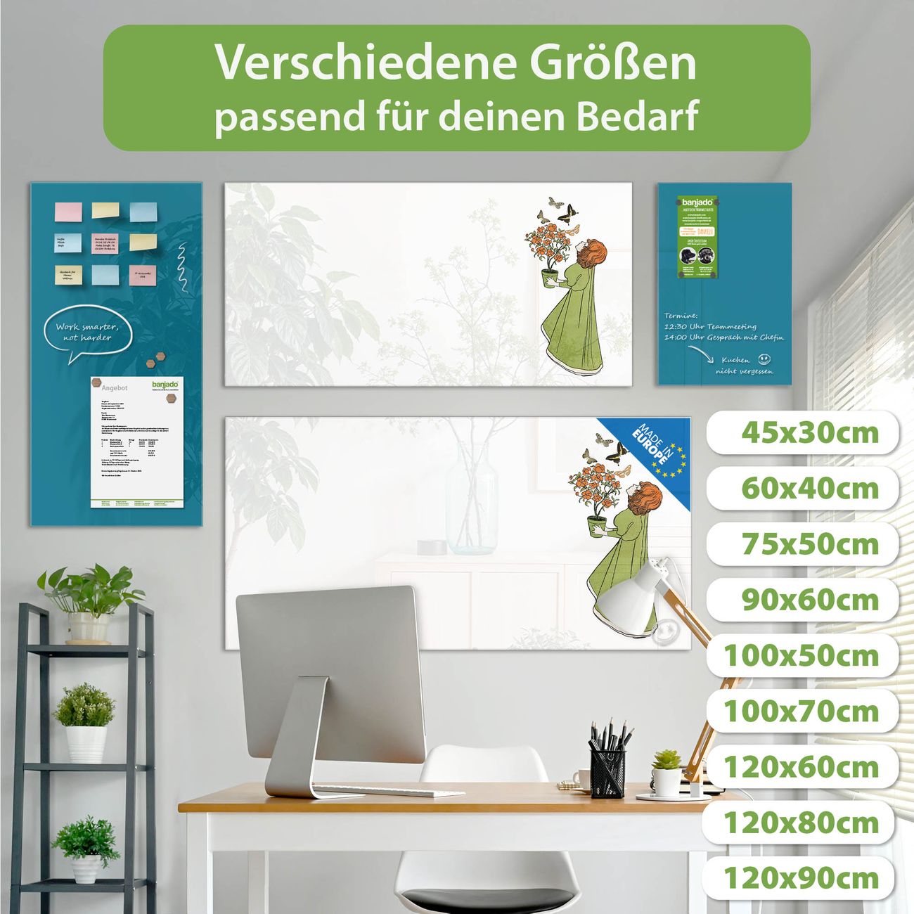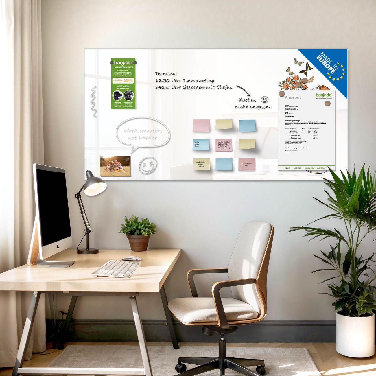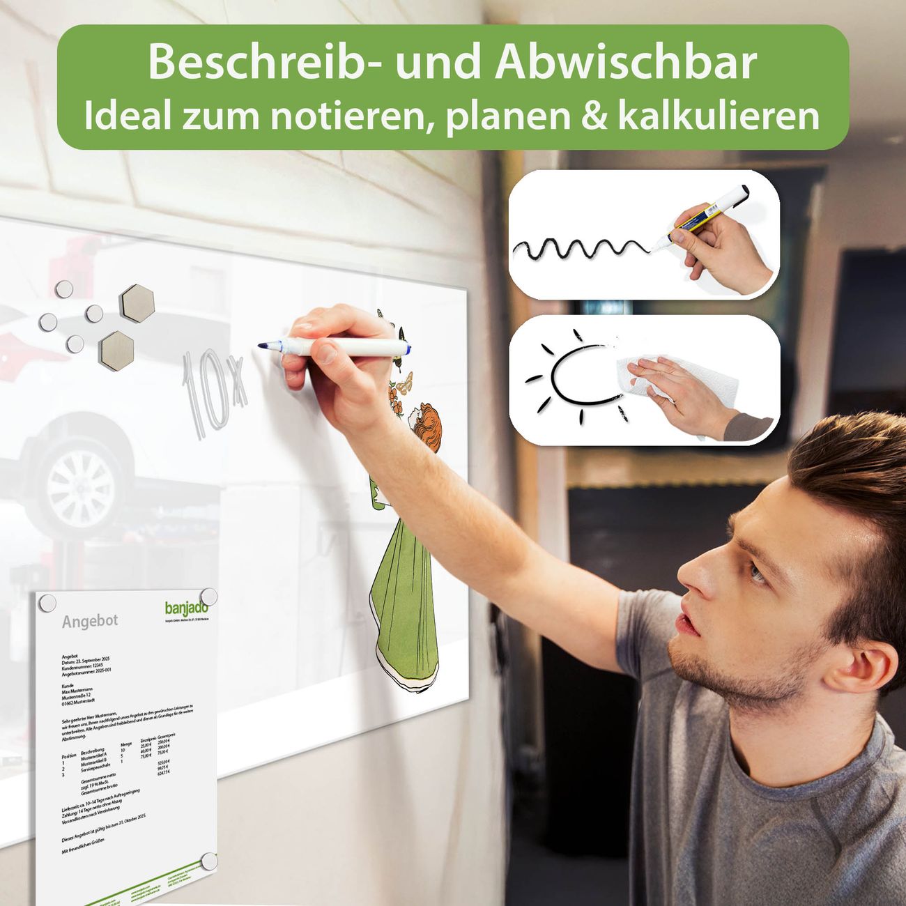 Jede Glas Magnettafel wird in unserer Werkstatt von Hand gefertigt und sorgfältig geprüft. So erhalten Sie ein echtes Qualitätsprodukt, das Funktion und Ästhetik perfekt vereint.?? Warum banjado?