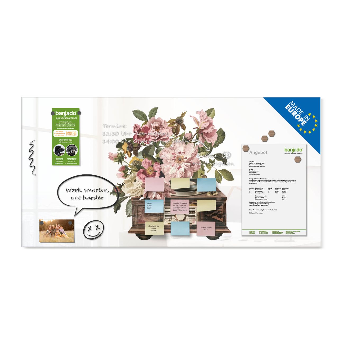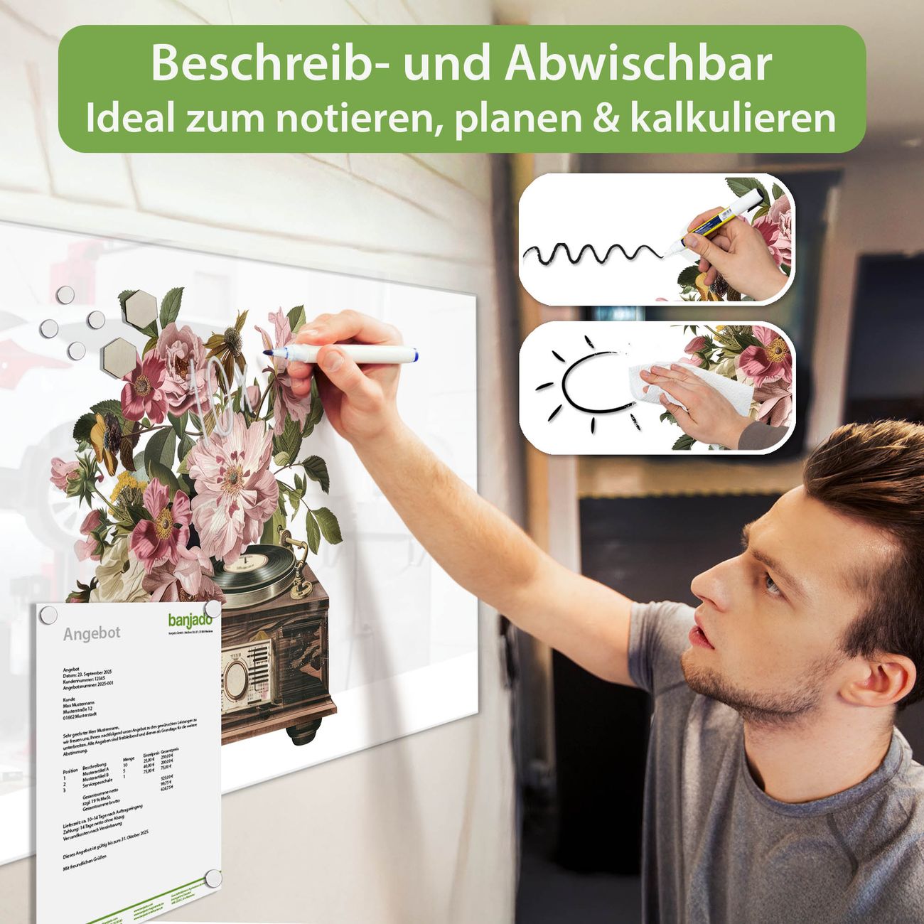 Jede Glas Magnettafel wird in unserer Werkstatt von Hand gefertigt und sorgfältig geprüft. So erhalten Sie ein echtes Qualitätsprodukt, das Funktion und Ästhetik perfekt vereint.?? Warum banjado?
