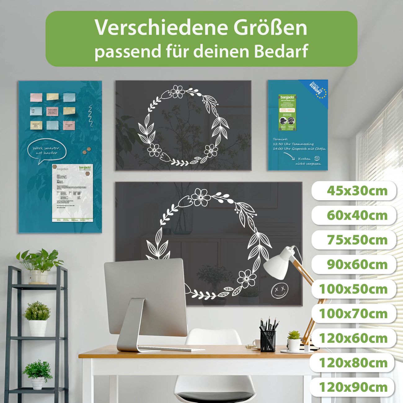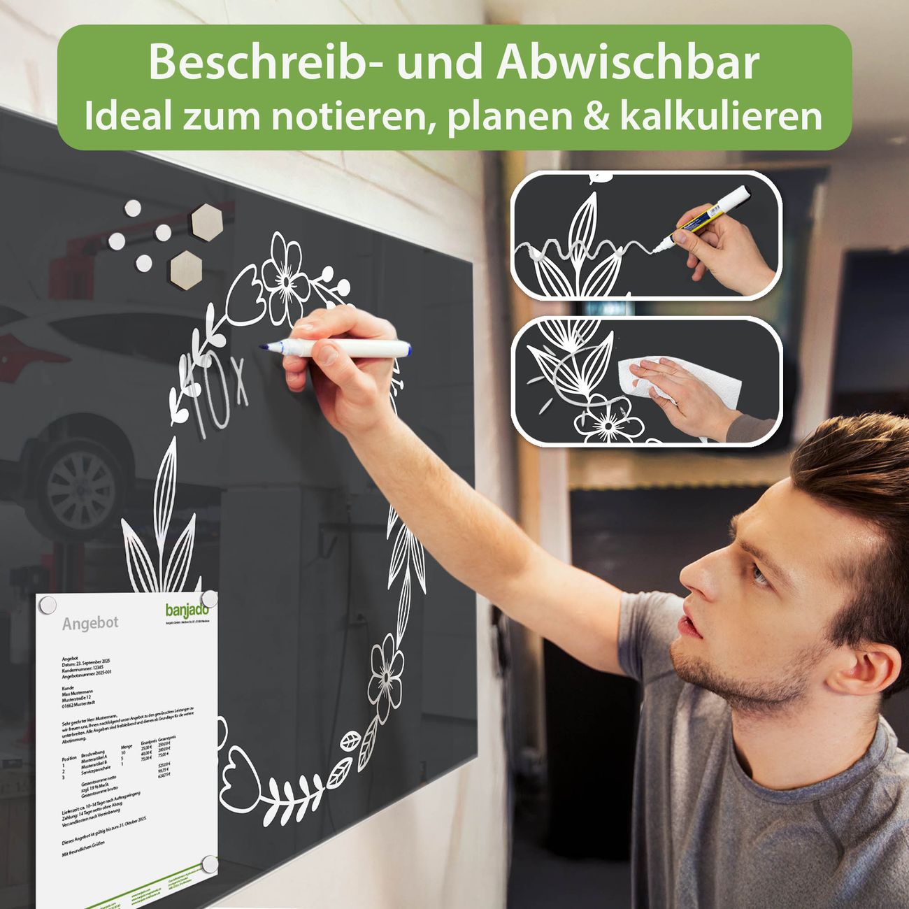 Jede Glas Magnettafel wird in unserer Werkstatt von Hand gefertigt und sorgfältig geprüft. So erhalten Sie ein echtes Qualitätsprodukt, das Funktion und Ästhetik perfekt vereint.?? Warum banjado?