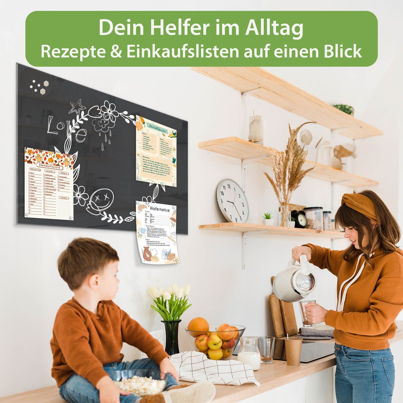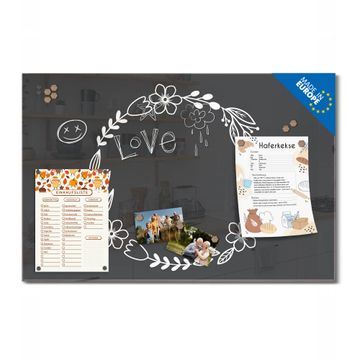 Auf der glatten Glasoberfläche lassen sich Termine, Rezepte oder Notizen ganz einfach mit Kreidestiften festhalten und rückstandslos entfernen. Starke Neodym-Magnete halten Ihre wichtigsten Erinnerungen sicher an Ort und Stelle. So entsteht Ihre ganz persönliche Ideenwand - jeden Tag neu.