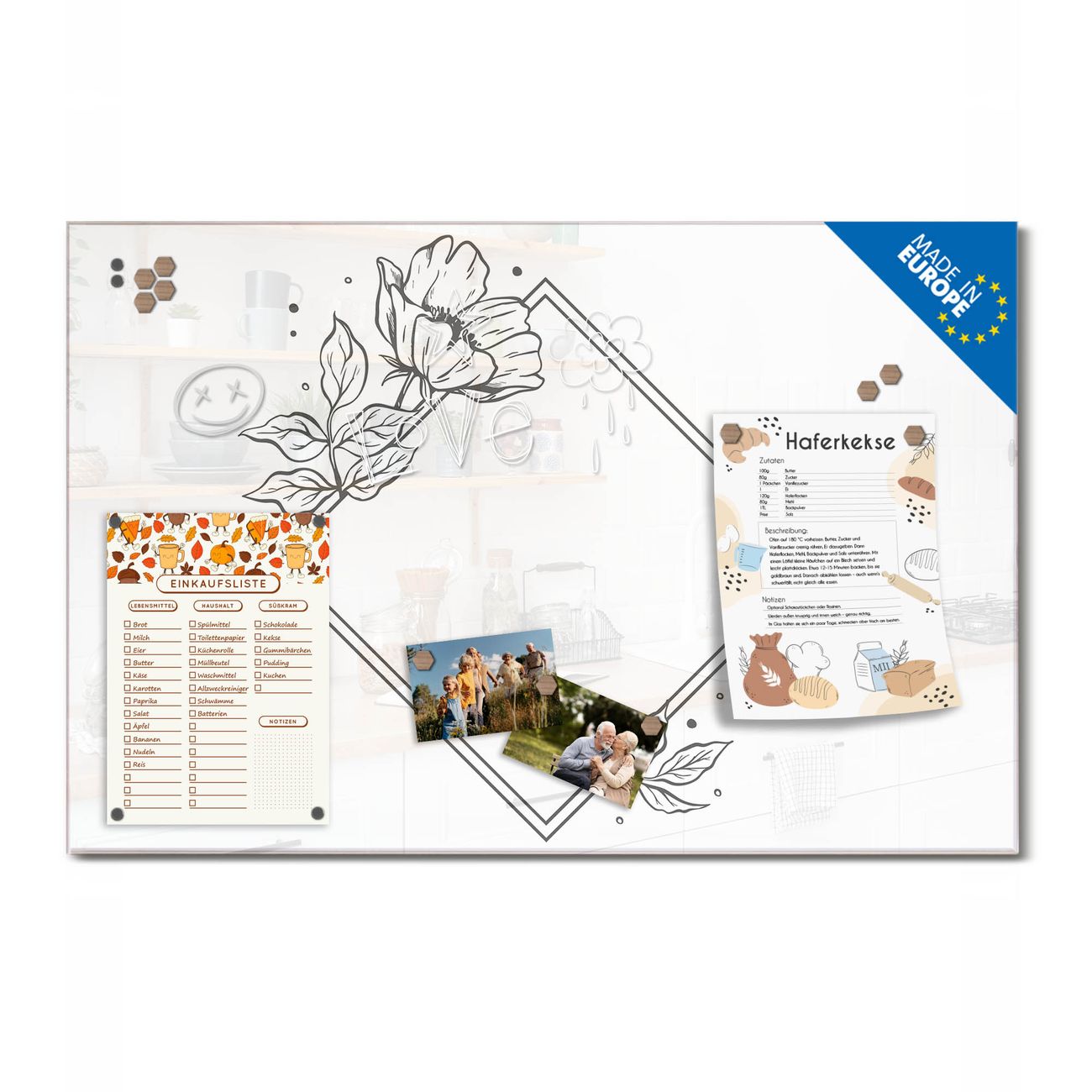 Auf der glatten Glasoberfläche lassen sich Termine, Rezepte oder Notizen ganz einfach mit Kreidestiften festhalten und rückstandslos entfernen. Starke Neodym-Magnete halten Ihre wichtigsten Erinnerungen sicher an Ort und Stelle. So entsteht Ihre ganz persönliche Ideenwand - jeden Tag neu.