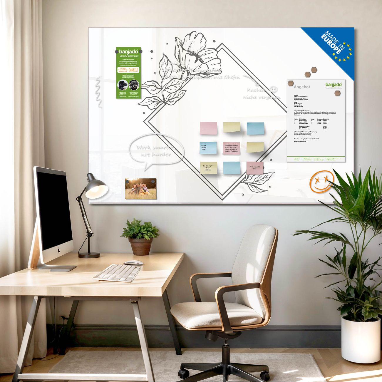 Die banjado Glas Magnettafel mit dem Motiv Motiv Blütenrahmen verbindet Funktionalität mit Stil. Sie ersetzt das Zettelchaos durch klare Strukturen und bringt dabei eine warme, natürliche Atmosphäre in Ihr Zuhause. Ob im Büro, in der Küche oder im Eingangsbereich - dieses Design-Board zieht Blicke an und sorgt für Ordnung mit Charakter.