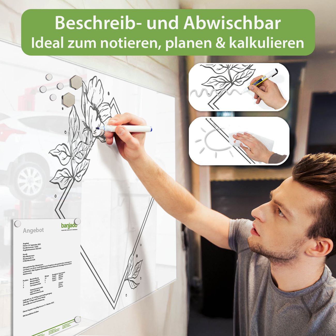 Jede Glas Magnettafel wird in unserer Werkstatt von Hand gefertigt und sorgfältig geprüft. So erhalten Sie ein echtes Qualitätsprodukt, das Funktion und Ästhetik perfekt vereint.?? Warum banjado?
