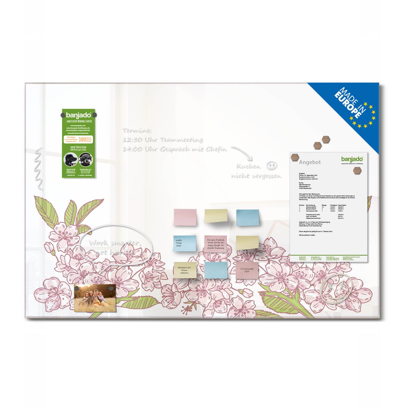 Jede Glas Magnettafel wird in unserer Werkstatt von Hand gefertigt und sorgfältig geprüft. So erhalten Sie ein echtes Qualitätsprodukt, das Funktion und Ästhetik perfekt vereint.?? Warum banjado?