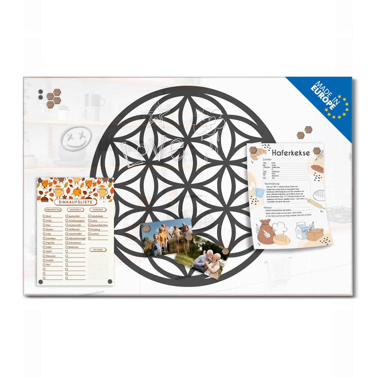 Ein Stück Design, das Ihren Alltag organisiert. Schreiben, heften, inspirieren - alles an einem Ort. Qualität, die man spürt. Montage leicht gemacht. Handwerk mit Herz - veredelt in Sachsen. Einzigartiges Design mit Motiv Motiv Blume des Lebens Muster Beschreibbare Glasoberfläche, leicht zu reinigen Starke Magnetkraft durch Stahlrückwand Inklusive 4 Neodym-Magneten Flexible Montageoptionen Handveredelt in Sachsen - Qualität, die bleibt