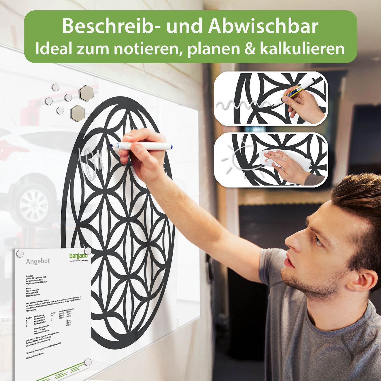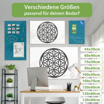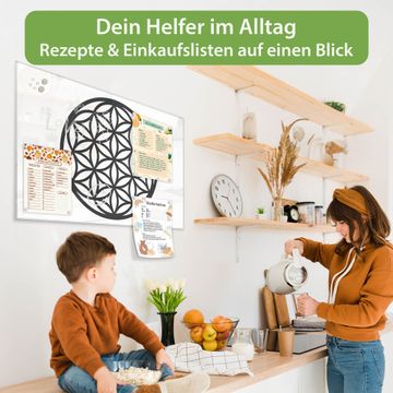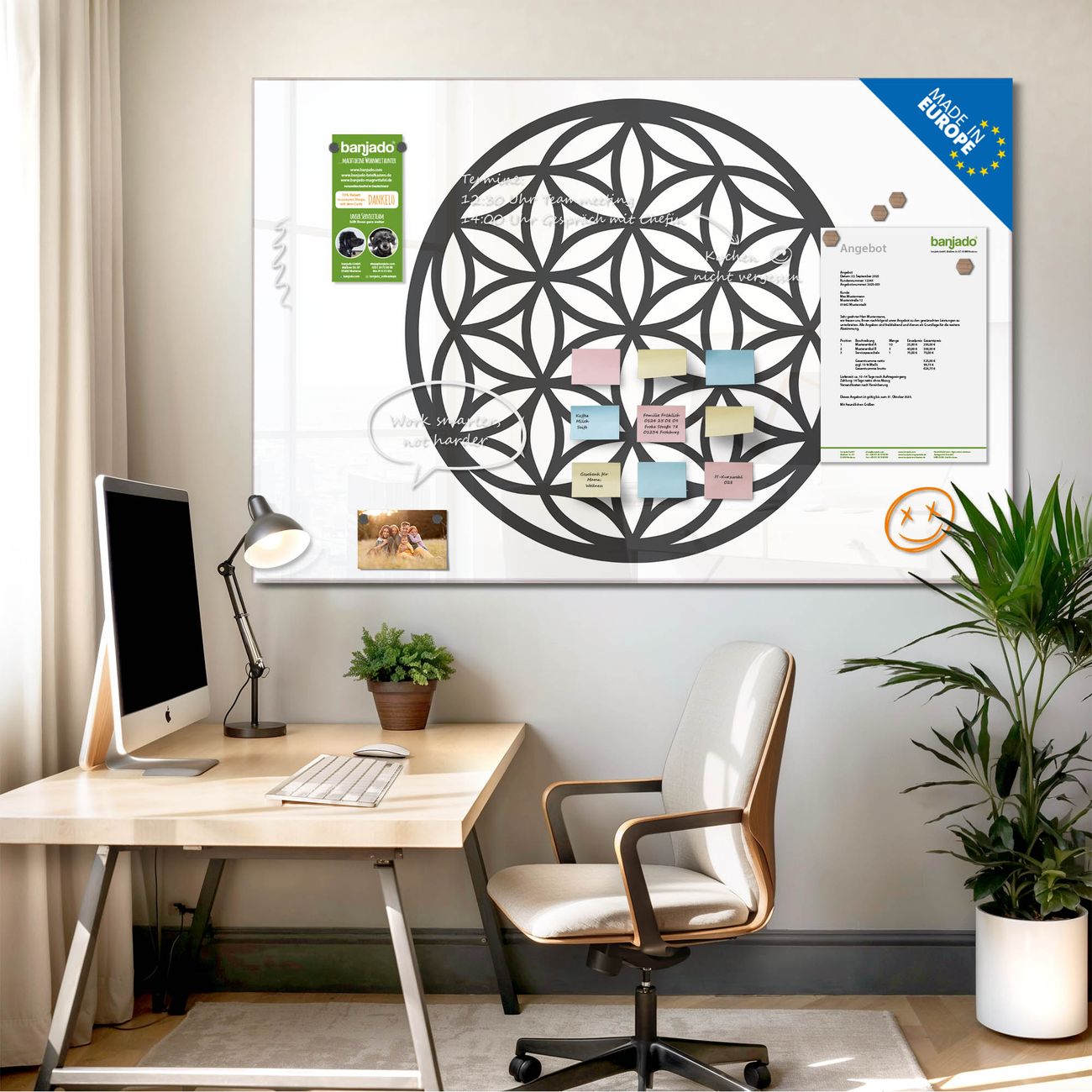 Die banjado Glas Magnettafel mit dem Motiv Motiv Blume des Lebens Muster verbindet Funktionalität mit Stil. Sie ersetzt das Zettelchaos durch klare Strukturen und bringt dabei eine warme, natürliche Atmosphäre in Ihr Zuhause. Ob im Büro, in der Küche oder im Eingangsbereich - dieses Design-Board zieht Blicke an und sorgt für Ordnung mit Charakter.