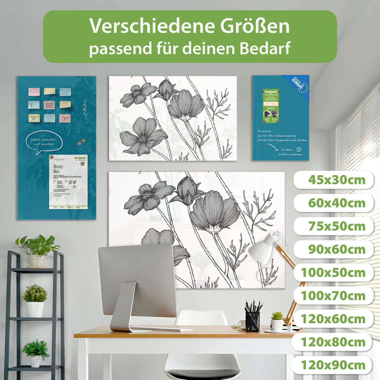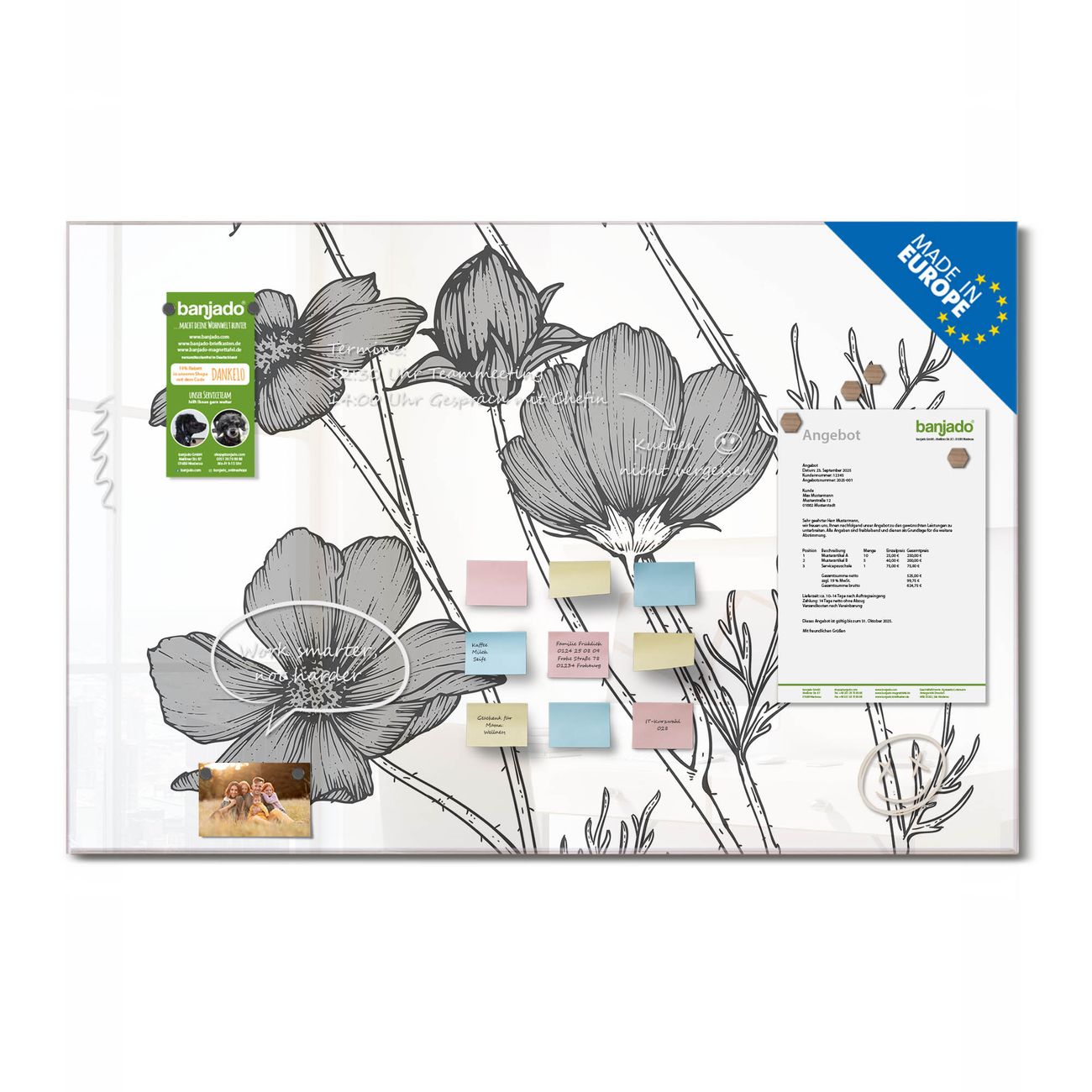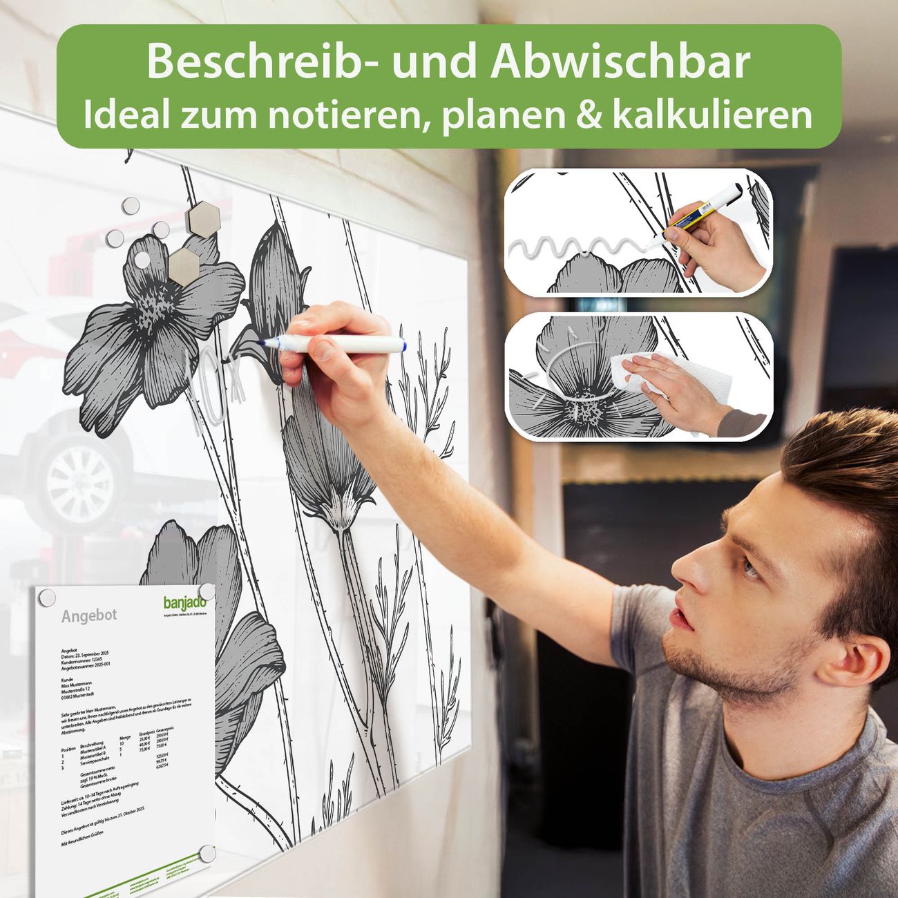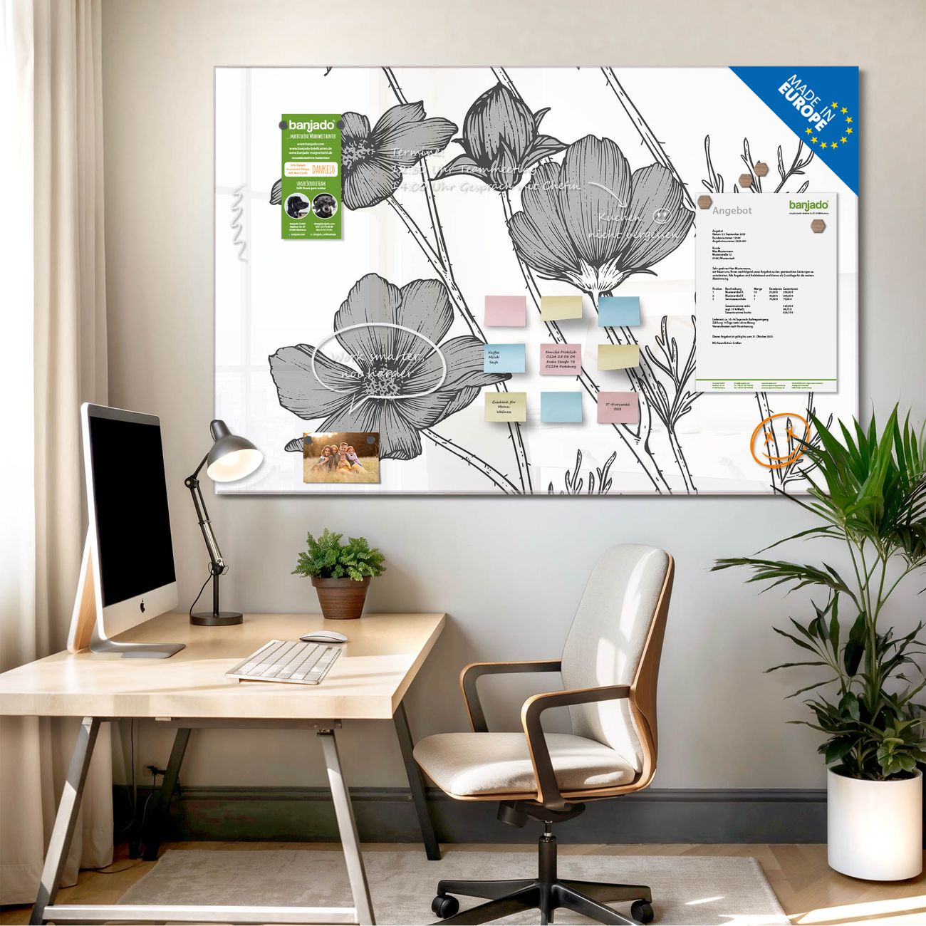 Die banjado Glas Magnettafel mit dem Motiv Motiv Blumen in Schwarz-Weiß verbindet Funktionalität mit Stil. Sie ersetzt das Zettelchaos durch klare Strukturen und bringt dabei eine warme, natürliche Atmosphäre in Ihr Zuhause. Ob im Büro, in der Küche oder im Eingangsbereich - dieses Design-Board zieht Blicke an und sorgt für Ordnung mit Charakter.