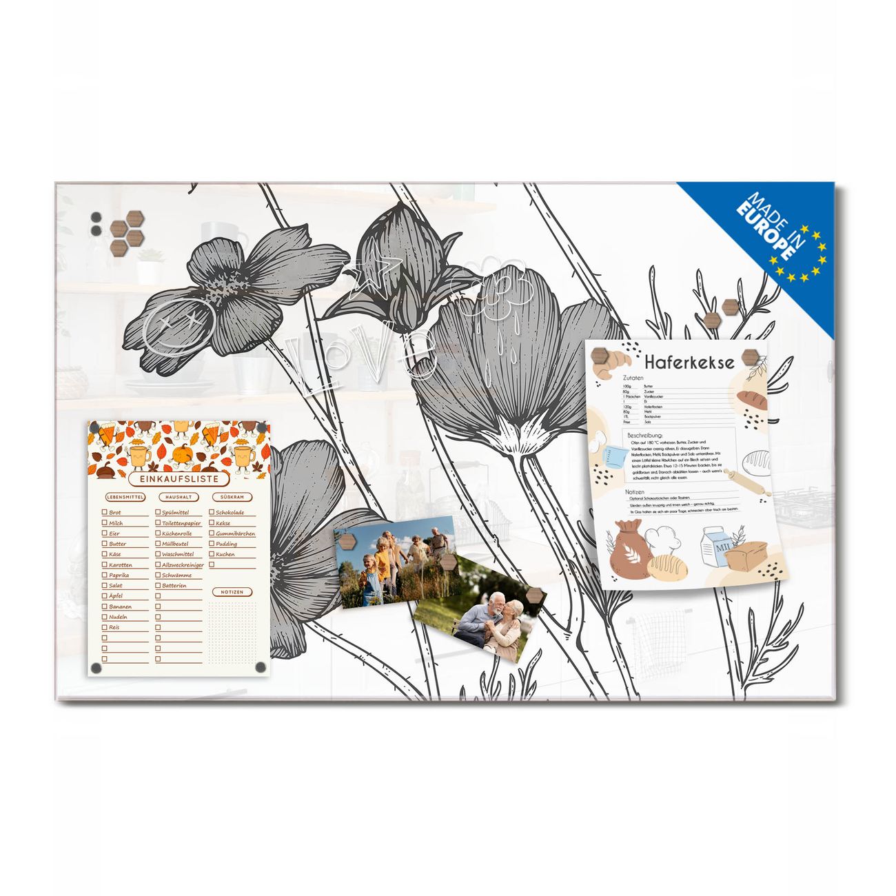 Ein Stück Design, das Ihren Alltag organisiert. Schreiben, heften, inspirieren - alles an einem Ort. Qualität, die man spürt. Montage leicht gemacht. Handwerk mit Herz - veredelt in Sachsen. Einzigartiges Design mit Motiv Motiv Blumen in Schwarz-Weiß Beschreibbare Glasoberfläche, leicht zu reinigen Starke Magnetkraft durch Stahlrückwand Inklusive 4 Neodym-Magneten Flexible Montageoptionen Handveredelt in Sachsen - Qualität, die bleibt