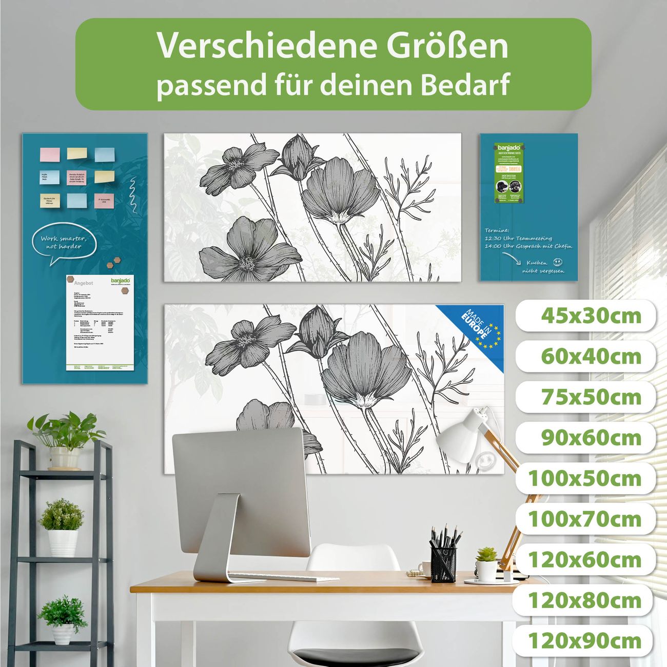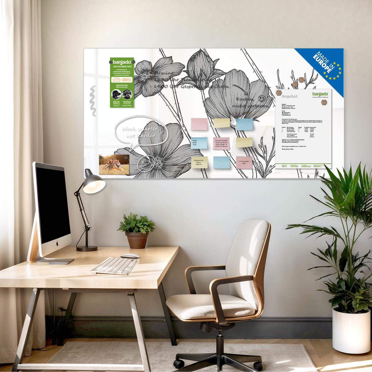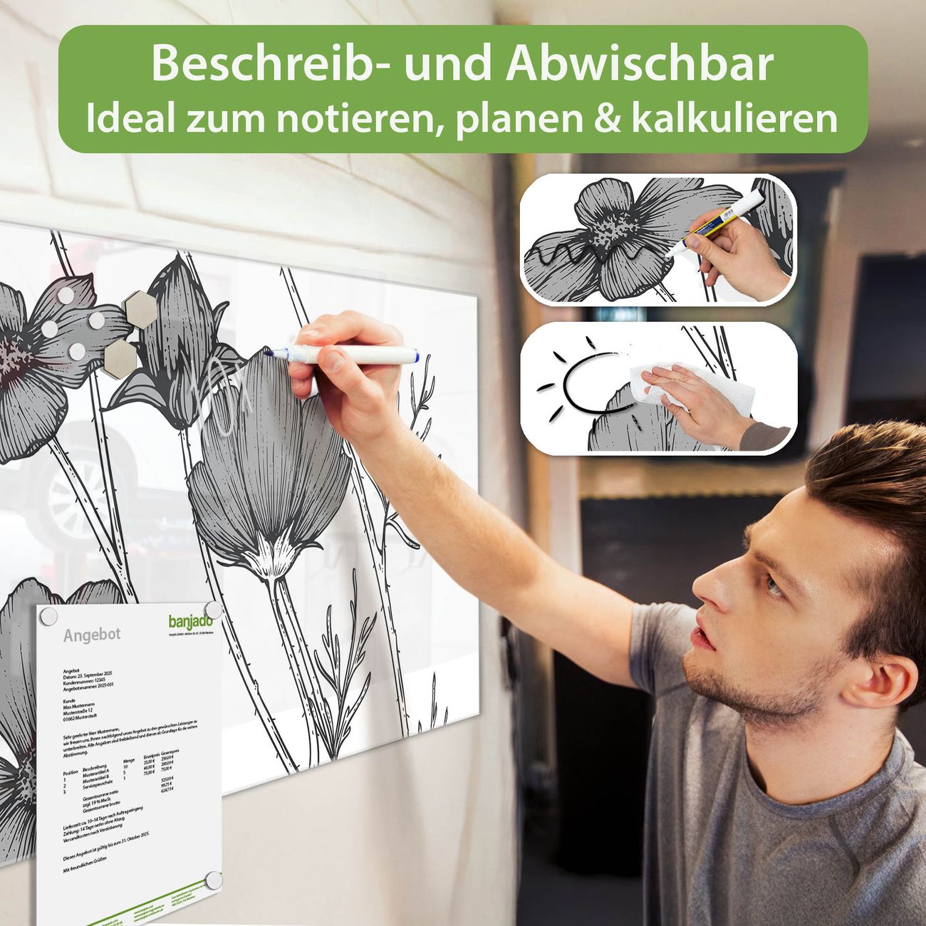 Jede Glas Magnettafel wird in unserer Werkstatt von Hand gefertigt und sorgfältig geprüft. So erhalten Sie ein echtes Qualitätsprodukt, das Funktion und Ästhetik perfekt vereint.?? Warum banjado?