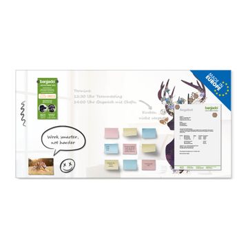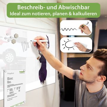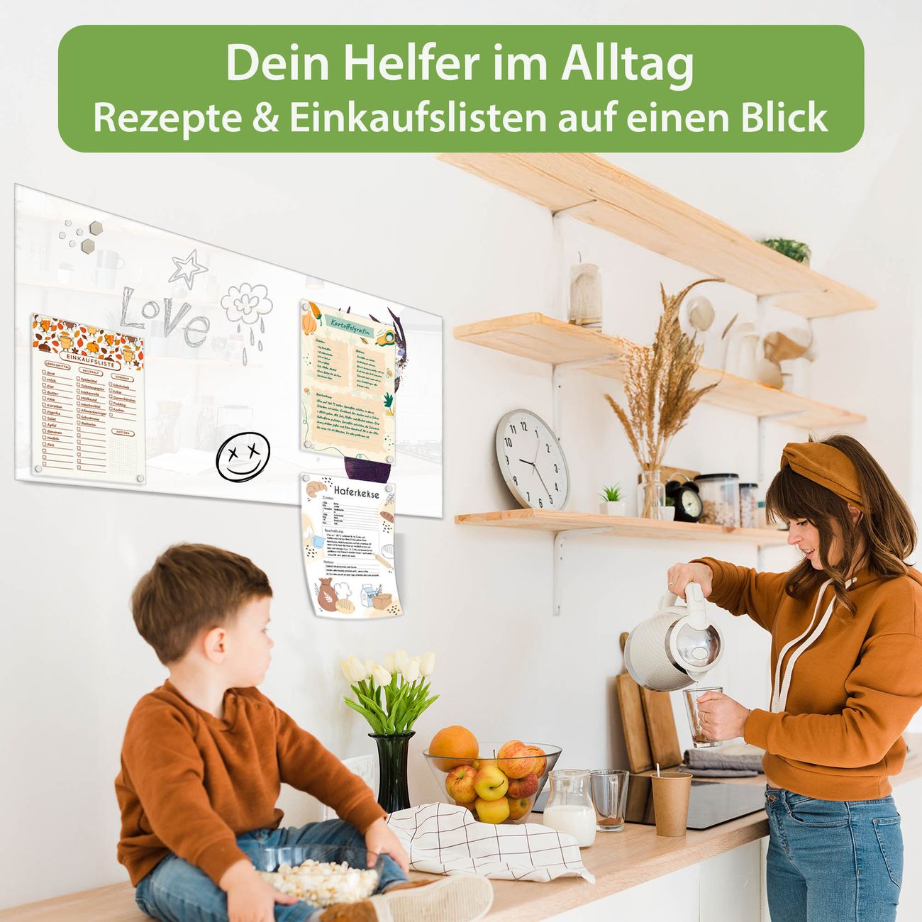 Auf der glatten Glasoberfläche lassen sich Termine, Rezepte oder Notizen ganz einfach mit Kreidestiften festhalten und rückstandslos entfernen. Starke Neodym-Magnete halten Ihre wichtigsten Erinnerungen sicher an Ort und Stelle. So entsteht Ihre ganz persönliche Ideenwand - jeden Tag neu.