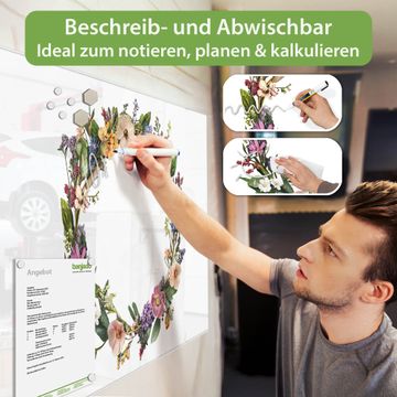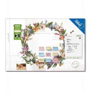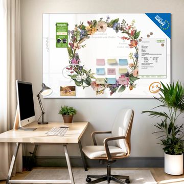 Die banjado Glas Magnettafel mit dem Motiv Motiv Blumenkranz der Jahreszeiten verbindet Funktionalität mit Stil. Sie ersetzt das Zettelchaos durch klare Strukturen und bringt dabei eine warme, natürliche Atmosphäre in Ihr Zuhause. Ob im Büro, in der Küche oder im Eingangsbereich - dieses Design-Board zieht Blicke an und sorgt für Ordnung mit Charakter.