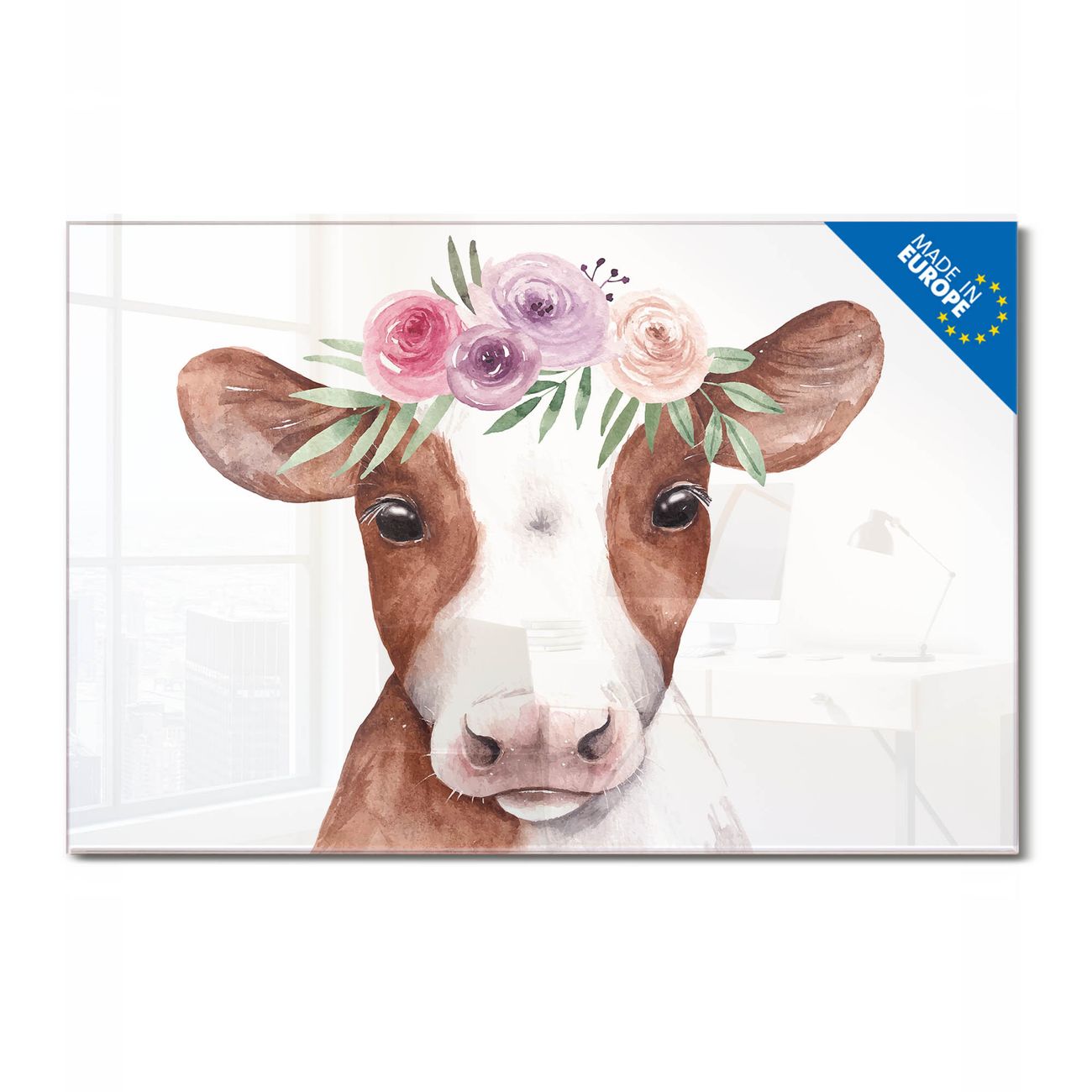 Glas Magnettafel im Querformat Motiv Blumenkronen-Kuh