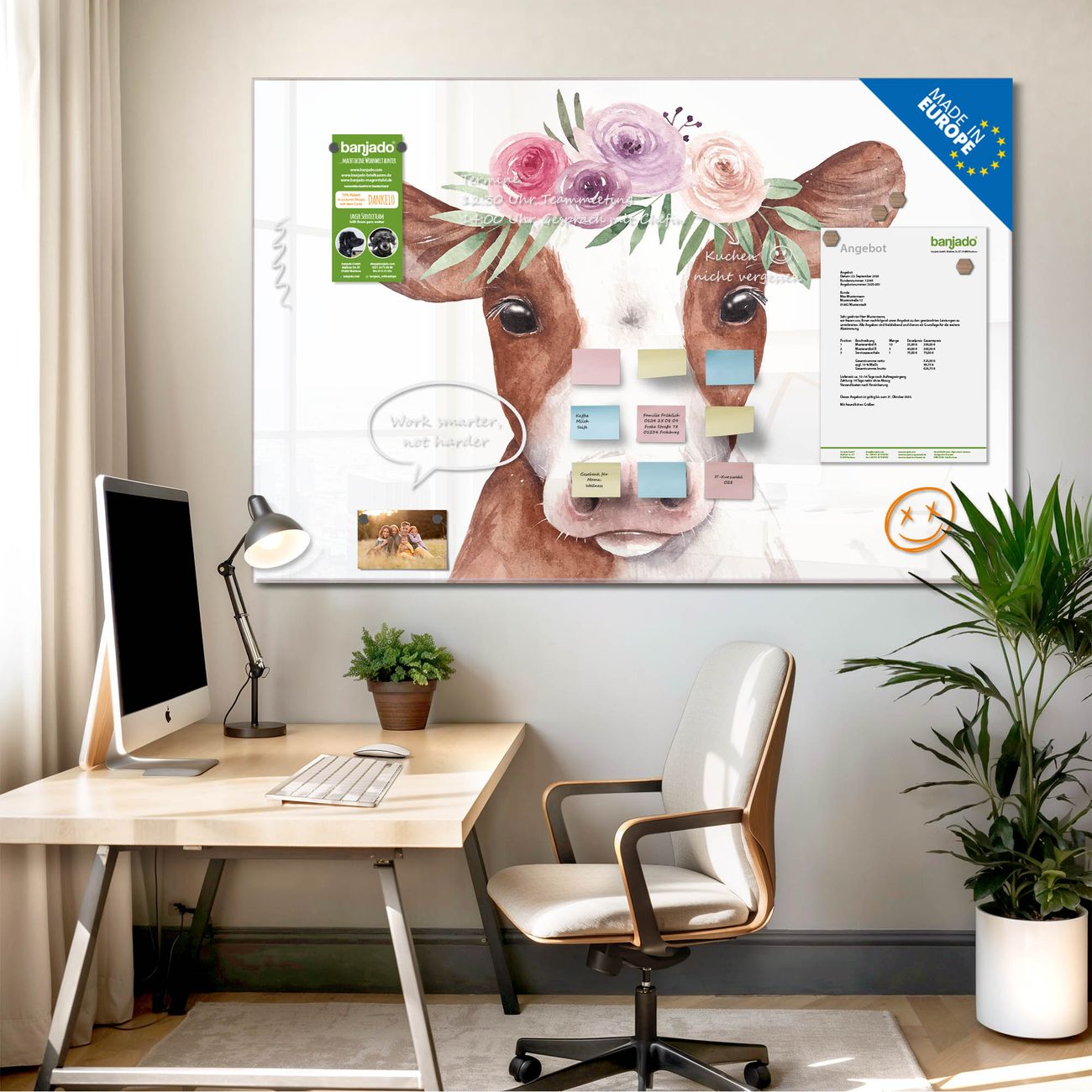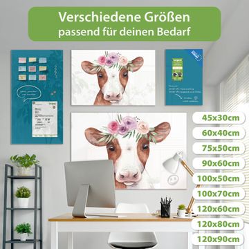 Die banjado Glas Magnettafel mit dem Motiv Motiv Blumenkronen-Kuh verbindet Funktionalität mit Stil. Sie ersetzt das Zettelchaos durch klare Strukturen und bringt dabei eine warme, natürliche Atmosphäre in Ihr Zuhause. Ob im Büro, in der Küche oder im Eingangsbereich - dieses Design-Board zieht Blicke an und sorgt für Ordnung mit Charakter.