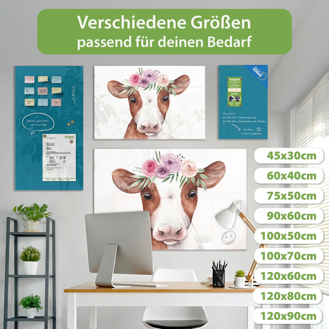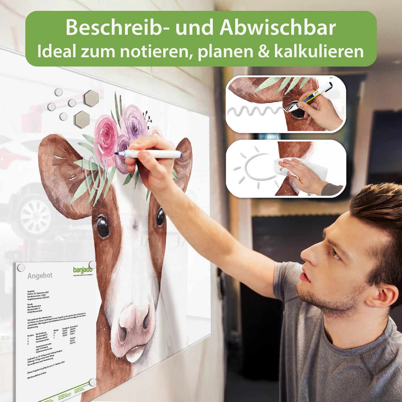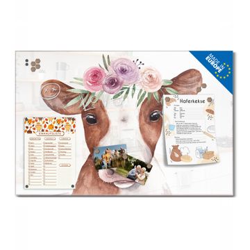 Ein Stück Design, das Ihren Alltag organisiert. Schreiben, heften, inspirieren - alles an einem Ort. Qualität, die man spürt. Montage leicht gemacht. Handwerk mit Herz - veredelt in Sachsen. Einzigartiges Design mit Motiv Motiv Blumenkronen-Kuh Beschreibbare Glasoberfläche, leicht zu reinigen Starke Magnetkraft durch Stahlrückwand Inklusive 4 Neodym-Magneten Flexible Montageoptionen Handveredelt in Sachsen - Qualität, die bleibt