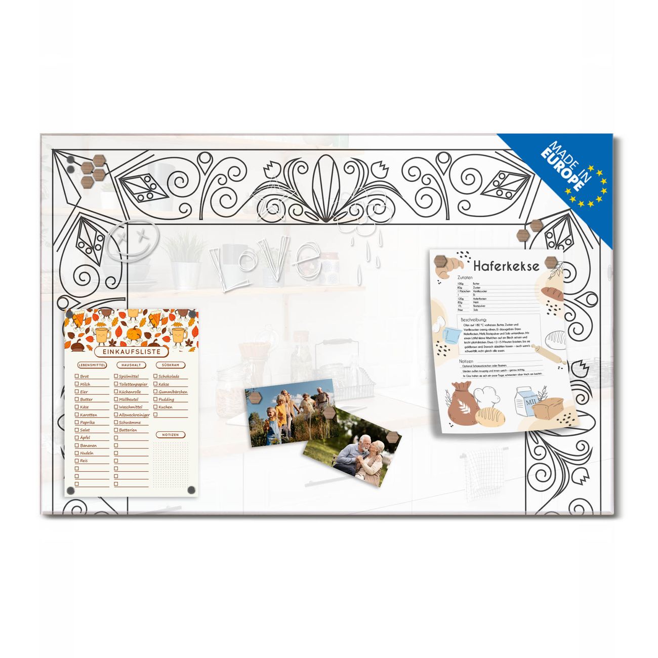Ein Stück Design, das Ihren Alltag organisiert. Schreiben, heften, inspirieren - alles an einem Ort. Qualität, die man spürt. Montage leicht gemacht. Handwerk mit Herz - veredelt in Sachsen. Einzigartiges Design mit Motiv Motiv Blumenornament-Rahmen Beschreibbare Glasoberfläche, leicht zu reinigen Starke Magnetkraft durch Stahlrückwand Inklusive 4 Neodym-Magneten Flexible Montageoptionen Handveredelt in Sachsen - Qualität, die bleibt