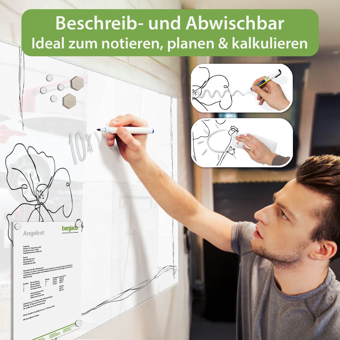 Bitte beachten Sie, dass ausschliessliche spezielle Magnete an der Glastafel haften. Wir empfehlen banjado Neodym Magnete, diese sind durch uns auf Wirksamkeit geprüft.
