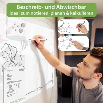 Auf der glatten Glasoberfläche lassen sich Termine, Rezepte oder Notizen ganz einfach mit Kreidestiften festhalten und rückstandslos entfernen. Starke Neodym-Magnete halten Ihre wichtigsten Erinnerungen sicher an Ort und Stelle. So entsteht Ihre ganz persönliche Ideenwand - jeden Tag neu.