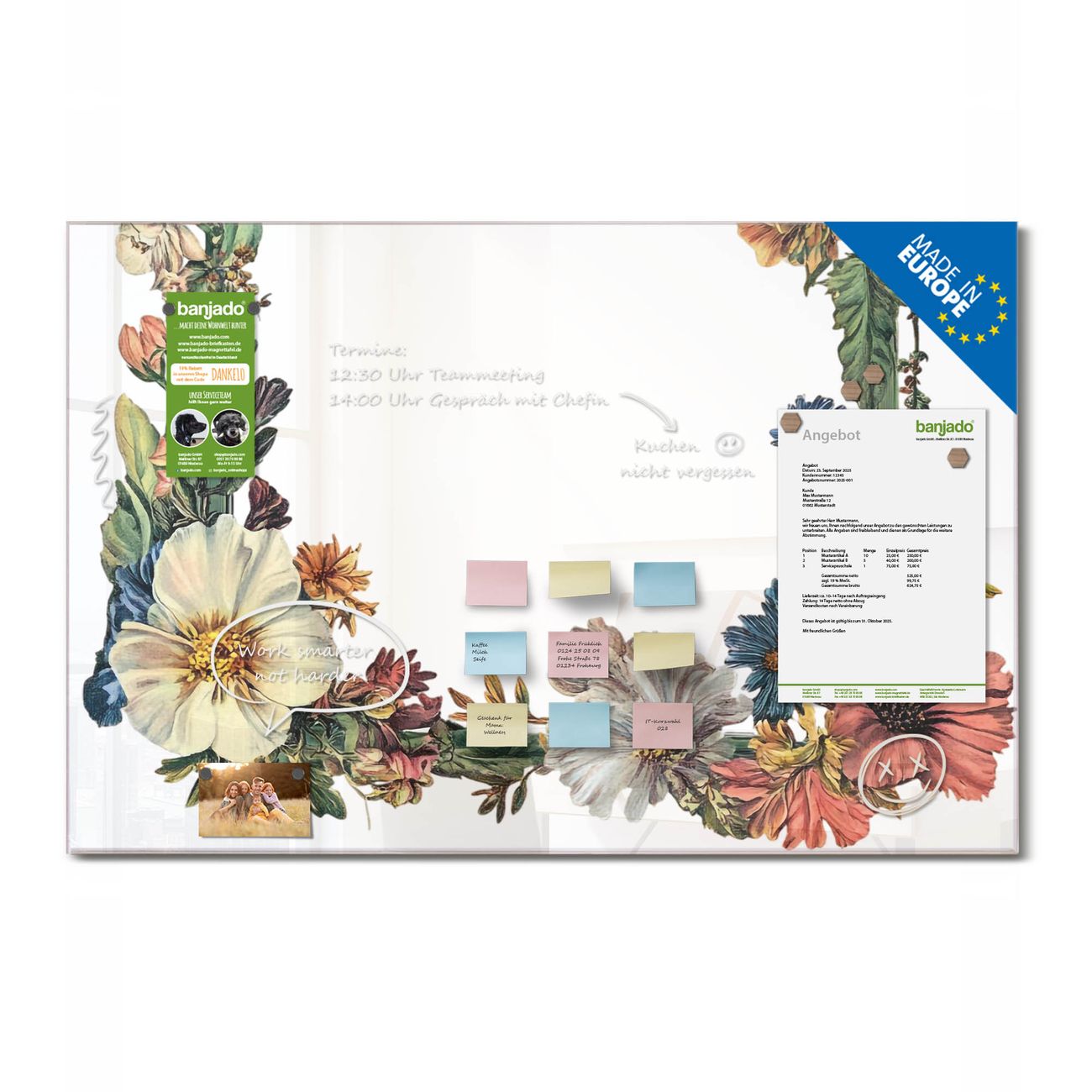 Ein Stück Design, das Ihren Alltag organisiert. Schreiben, heften, inspirieren - alles an einem Ort. Qualität, die man spürt. Montage leicht gemacht. Handwerk mit Herz - veredelt in Sachsen. Einzigartiges Design mit Motiv Motiv Blumenrahmen Beschreibbare Glasoberfläche, leicht zu reinigen Starke Magnetkraft durch Stahlrückwand Inklusive 4 Neodym-Magneten Flexible Montageoptionen Handveredelt in Sachsen - Qualität, die bleibt