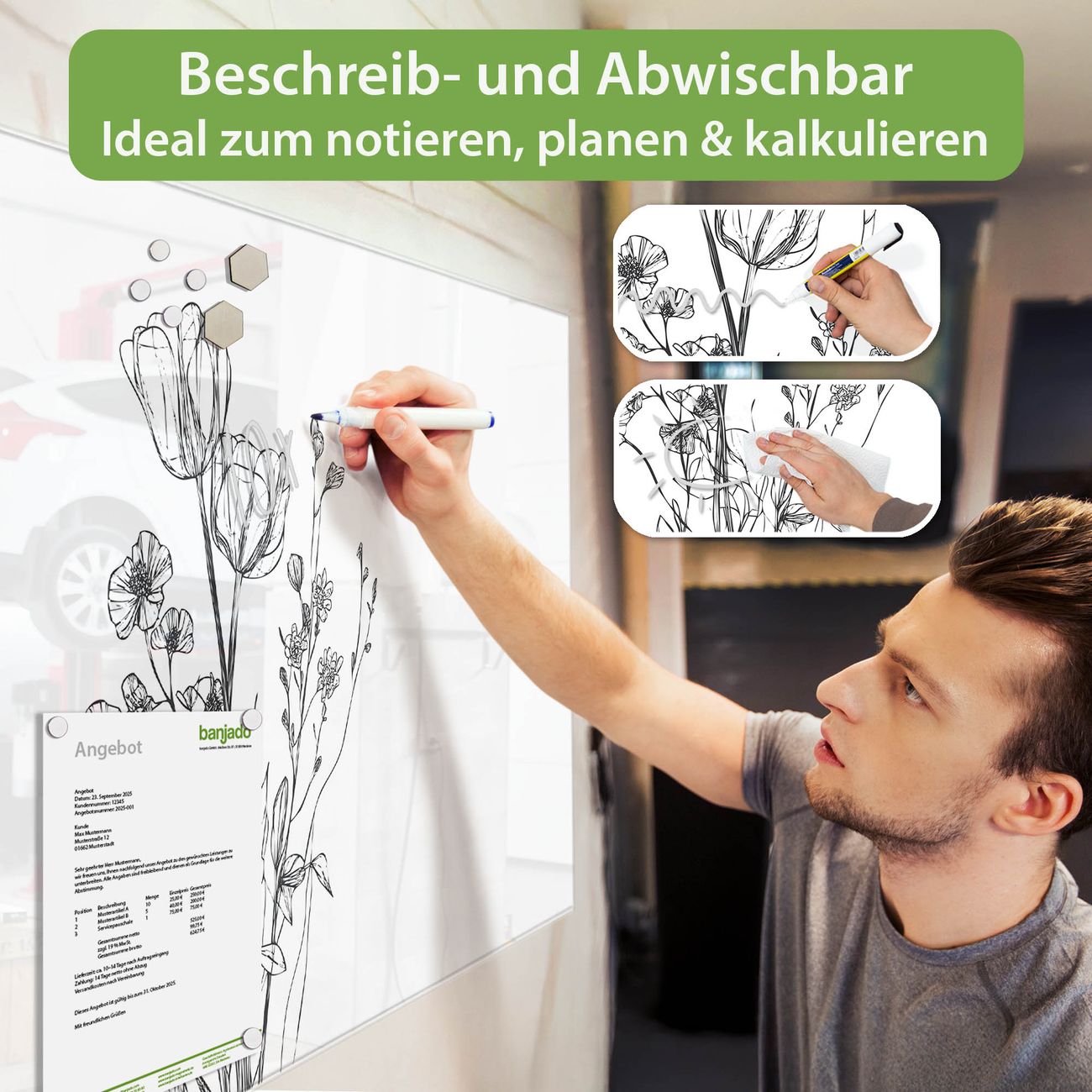 Jede Glas Magnettafel wird in unserer Werkstatt von Hand gefertigt und sorgfältig geprüft. So erhalten Sie ein echtes Qualitätsprodukt, das Funktion und Ästhetik perfekt vereint.?? Warum banjado?