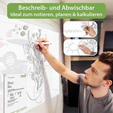 Auf der glatten Glasoberfläche lassen sich Termine, Rezepte oder Notizen ganz einfach mit Kreidestiften festhalten und rückstandslos entfernen. Starke Neodym-Magnete halten Ihre wichtigsten Erinnerungen sicher an Ort und Stelle. So entsteht Ihre ganz persönliche Ideenwand - jeden Tag neu.