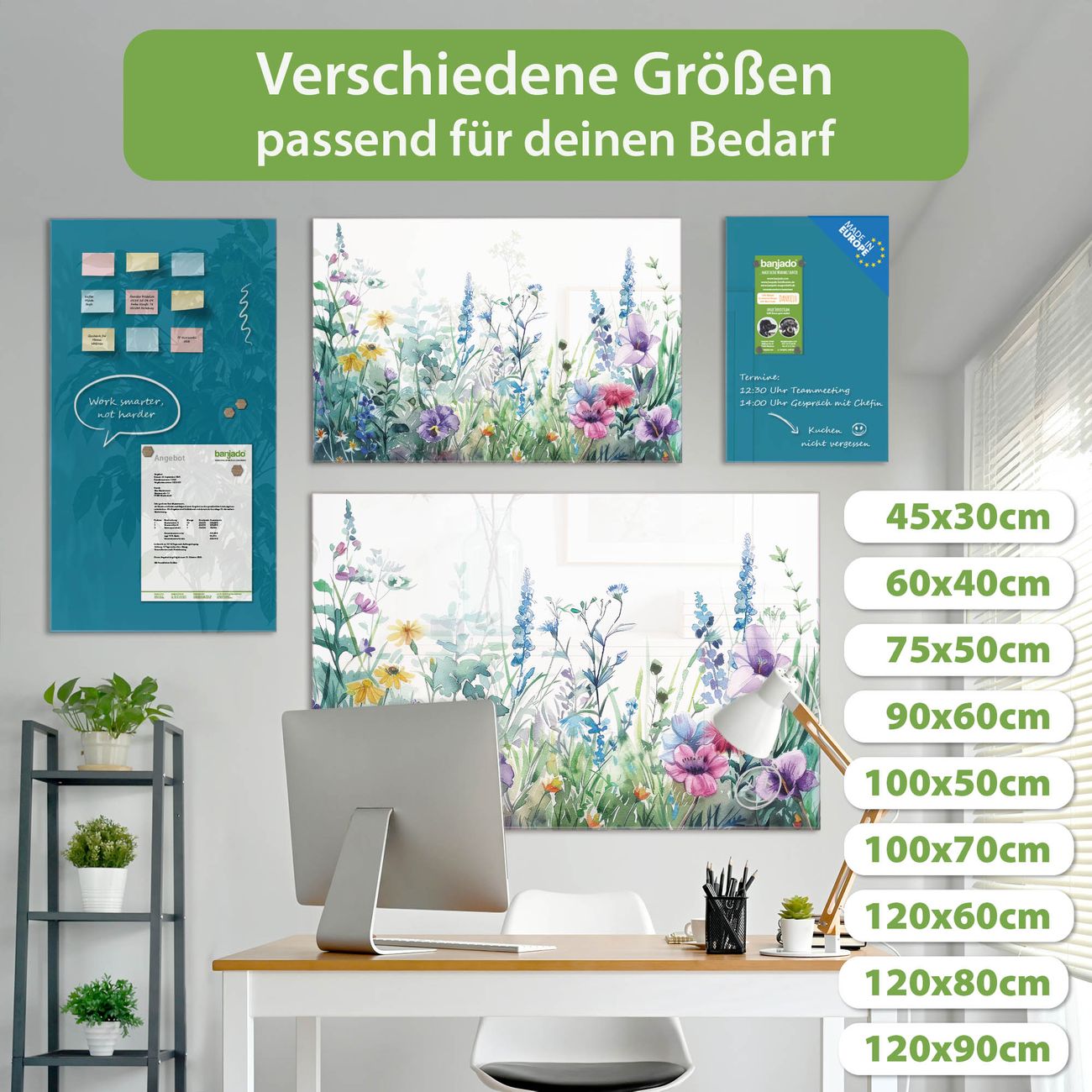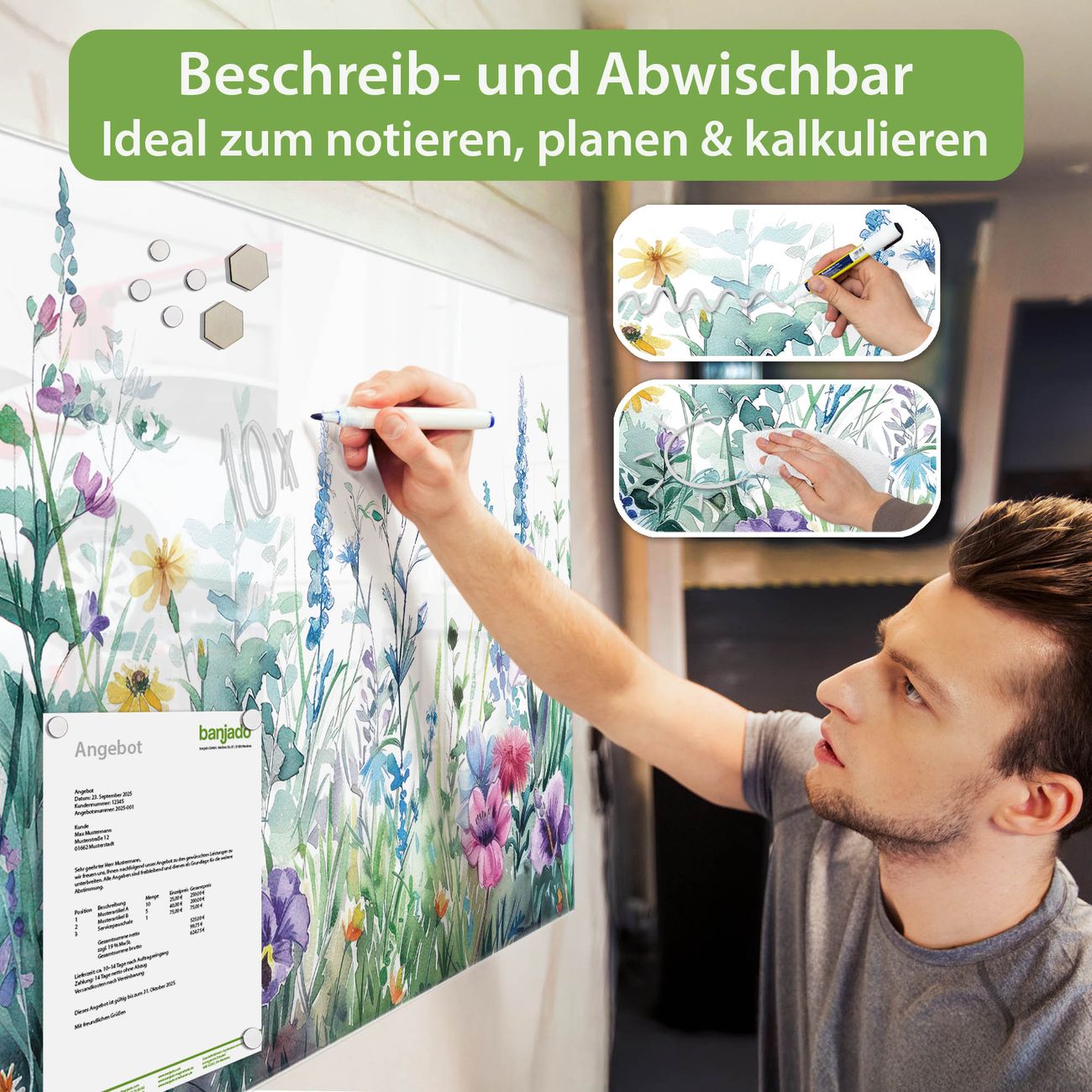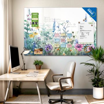 Die banjado Glas Magnettafel mit dem Motiv Motiv Blumenwiese in Aquarell verbindet Funktionalität mit Stil. Sie ersetzt das Zettelchaos durch klare Strukturen und bringt dabei eine warme, natürliche Atmosphäre in Ihr Zuhause. Ob im Büro, in der Küche oder im Eingangsbereich - dieses Design-Board zieht Blicke an und sorgt für Ordnung mit Charakter.