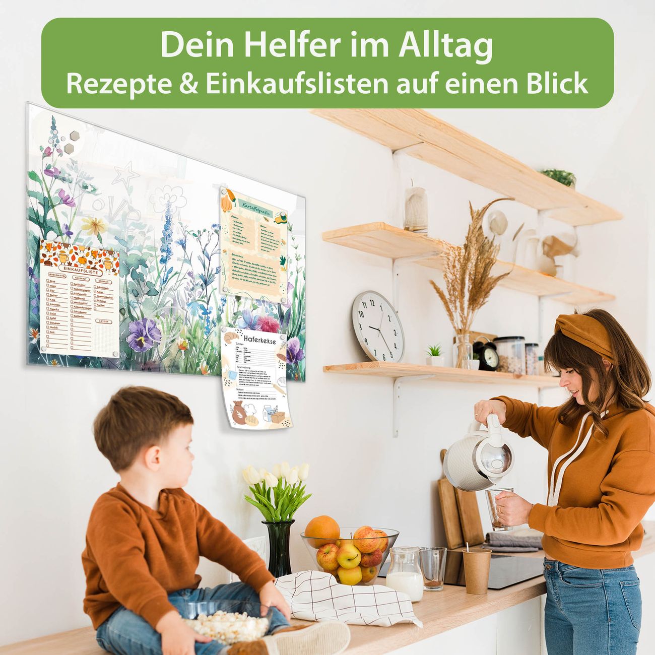 Ein Stück Design, das Ihren Alltag organisiert. Schreiben, heften, inspirieren - alles an einem Ort. Qualität, die man spürt. Montage leicht gemacht. Handwerk mit Herz - veredelt in Sachsen. Einzigartiges Design mit Motiv Motiv Blumenwiese in Aquarell Beschreibbare Glasoberfläche, leicht zu reinigen Starke Magnetkraft durch Stahlrückwand Inklusive 4 Neodym-Magneten Flexible Montageoptionen Handveredelt in Sachsen - Qualität, die bleibt