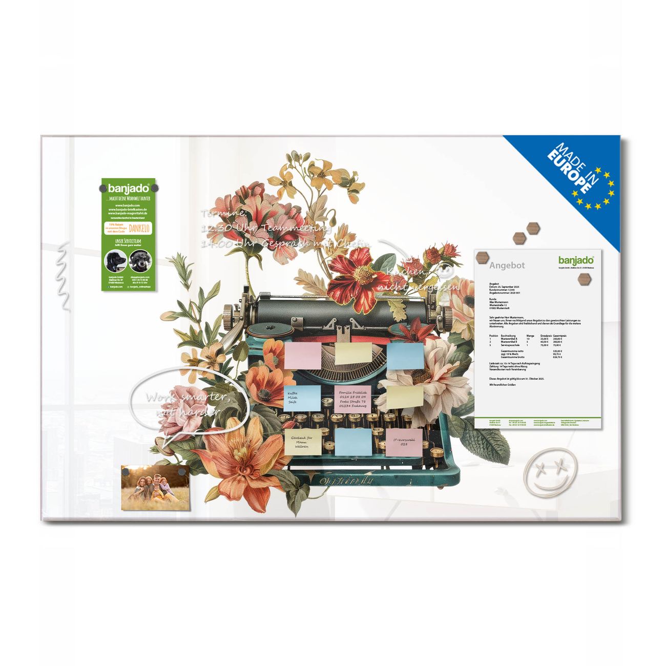 Ein Stück Design, das Ihren Alltag organisiert. Schreiben, heften, inspirieren - alles an einem Ort. Qualität, die man spürt. Montage leicht gemacht. Handwerk mit Herz - veredelt in Sachsen. Einzigartiges Design mit Motiv Motiv Blumige Schreibmaschine Beschreibbare Glasoberfläche, leicht zu reinigen Starke Magnetkraft durch Stahlrückwand Inklusive 4 Neodym-Magneten Flexible Montageoptionen Handveredelt in Sachsen - Qualität, die bleibt