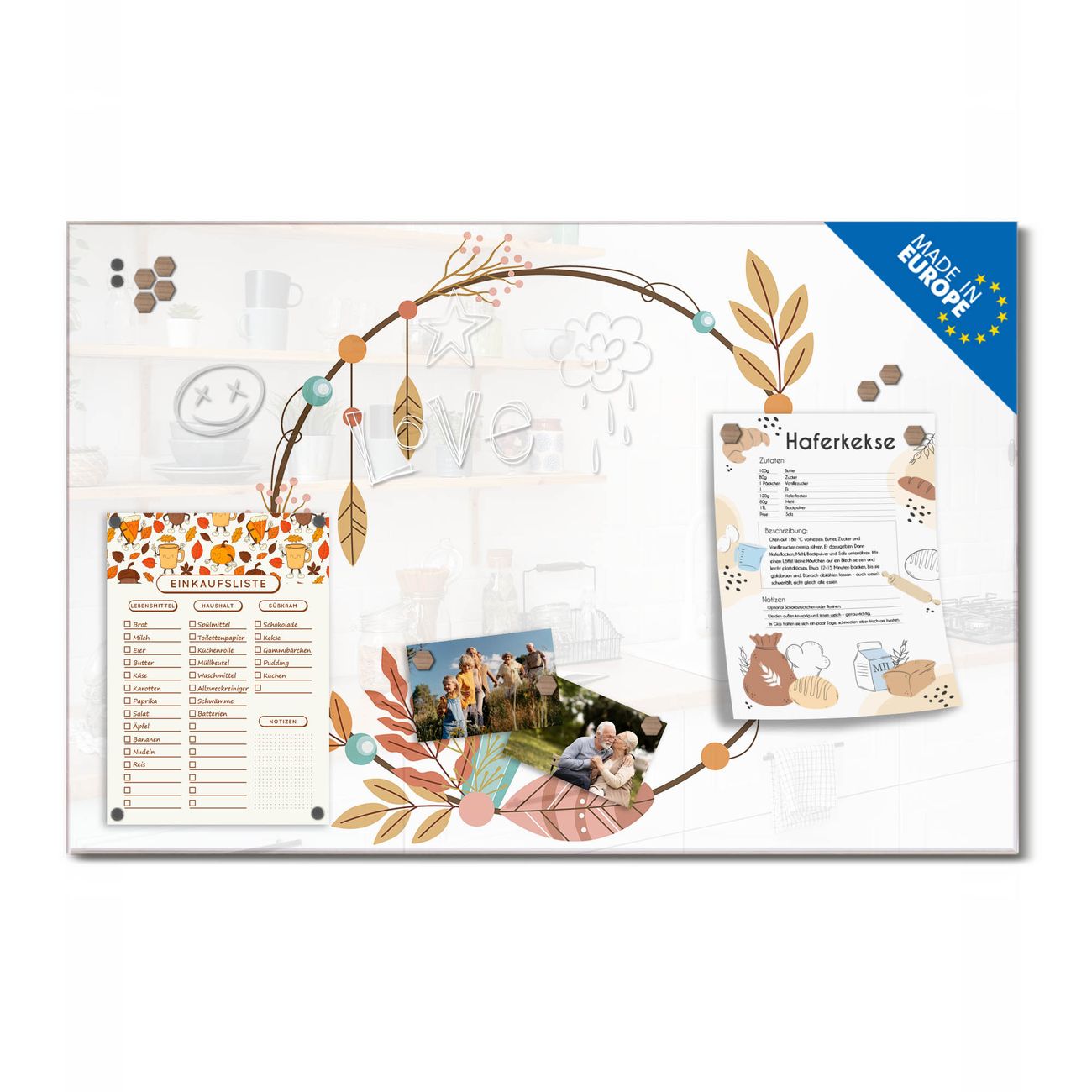 Ein Stück Design, das Ihren Alltag organisiert. Schreiben, heften, inspirieren - alles an einem Ort. Qualität, die man spürt. Montage leicht gemacht. Handwerk mit Herz - veredelt in Sachsen. Einzigartiges Design mit Motiv Motiv Boho Herbstkranz Beschreibbare Glasoberfläche, leicht zu reinigen Starke Magnetkraft durch Stahlrückwand Inklusive 4 Neodym-Magneten Flexible Montageoptionen Handveredelt in Sachsen - Qualität, die bleibt