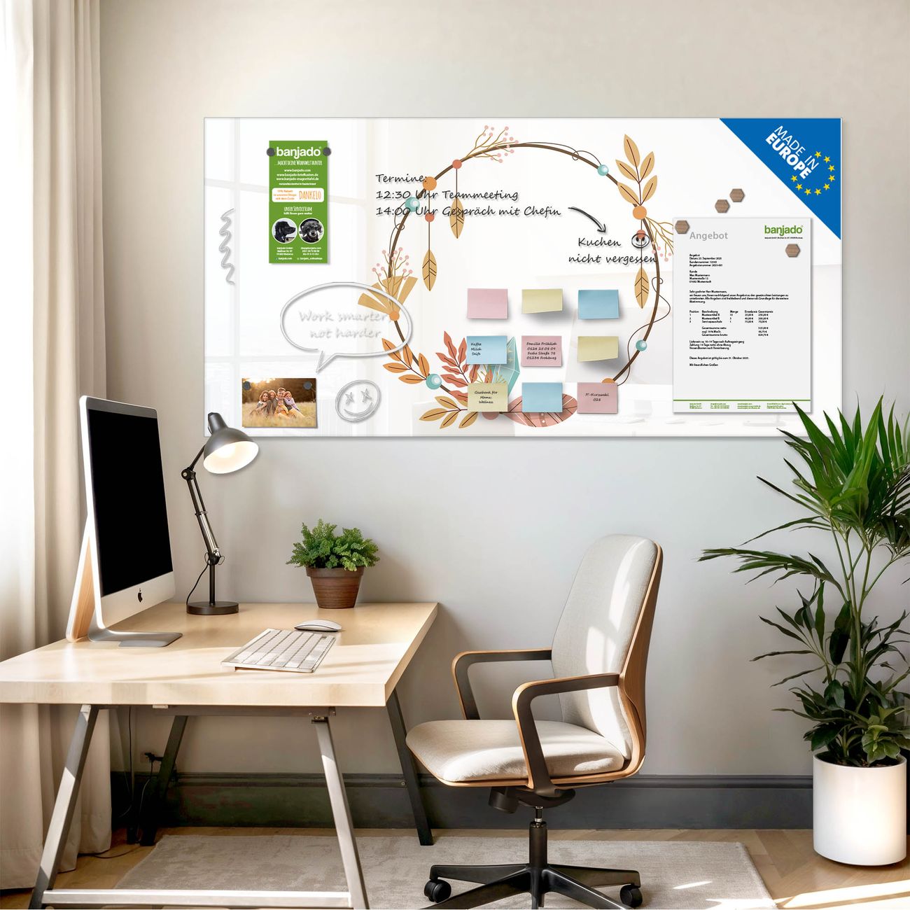Die banjado Glas Magnettafel mit dem Motiv Motiv Boho Herbstkranz verbindet Funktionalität mit Stil. Sie ersetzt das Zettelchaos durch klare Strukturen und bringt dabei eine warme, natürliche Atmosphäre in Ihr Zuhause. Ob im Büro, in der Küche oder im Eingangsbereich - dieses Design-Board zieht Blicke an und sorgt für Ordnung mit Charakter.