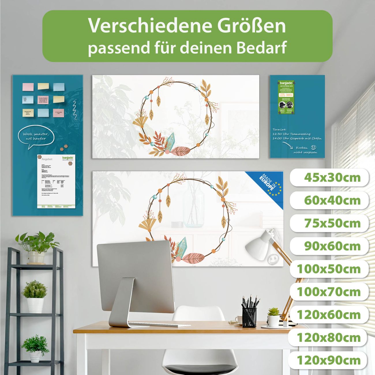 Ein Stück Design, das Ihren Alltag organisiert. Schreiben, heften, inspirieren - alles an einem Ort. Qualität, die man spürt. Montage leicht gemacht. Handwerk mit Herz - veredelt in Sachsen. Einzigartiges Design mit Motiv Motiv Boho Herbstkranz Beschreibbare Glasoberfläche, leicht zu reinigen Starke Magnetkraft durch Stahlrückwand Inklusive 4 Neodym-Magneten Flexible Montageoptionen Handveredelt in Sachsen - Qualität, die bleibt
